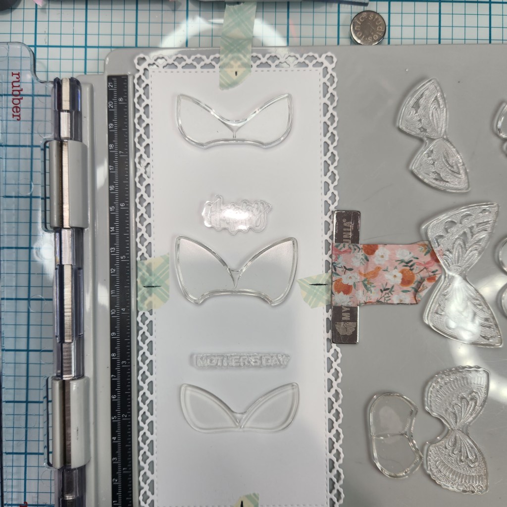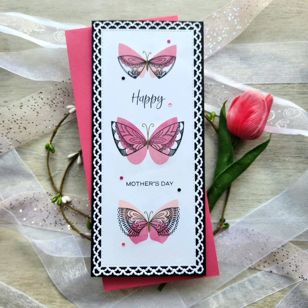 I just love this versatile stamp set from MFTStamps. I created this card for the current MFTStamps Color and Sketch Challenges and Simon Says Stamp’s Wednesday Challenge: Things with Wings. For this card, I used MFTStamps’ Brilliant Butterflies Stamp set. I rotated the design to make a vertical slimline card and used distressed oxide inks for stamping the butterflies. I had to use my math skills to make everything centered, spaced, and symmetrical đ (see photo below).