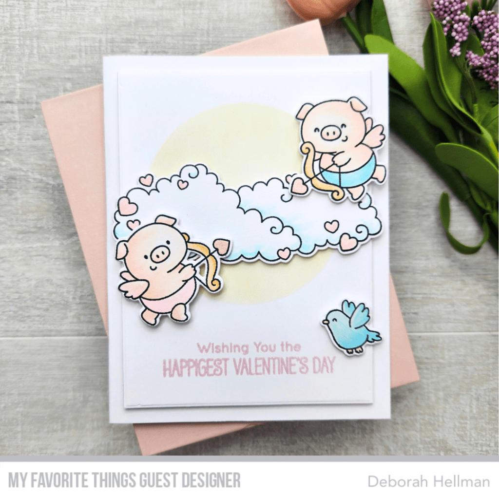 I used the new Jenoblade @jenoblade_ Cupigs Stamp and Die Duo to create this adorable “Cupig” Valentine’s Day Card. I also used the negative die cut from the A2 Rectangle Frames Die-namics for my white layer and the negative from the A2 Stitched Circle STAX Die-namics to create a circle stencil/mask for my ink blended sun behind the clouds. I added foam behind each of the layers for added dimension.