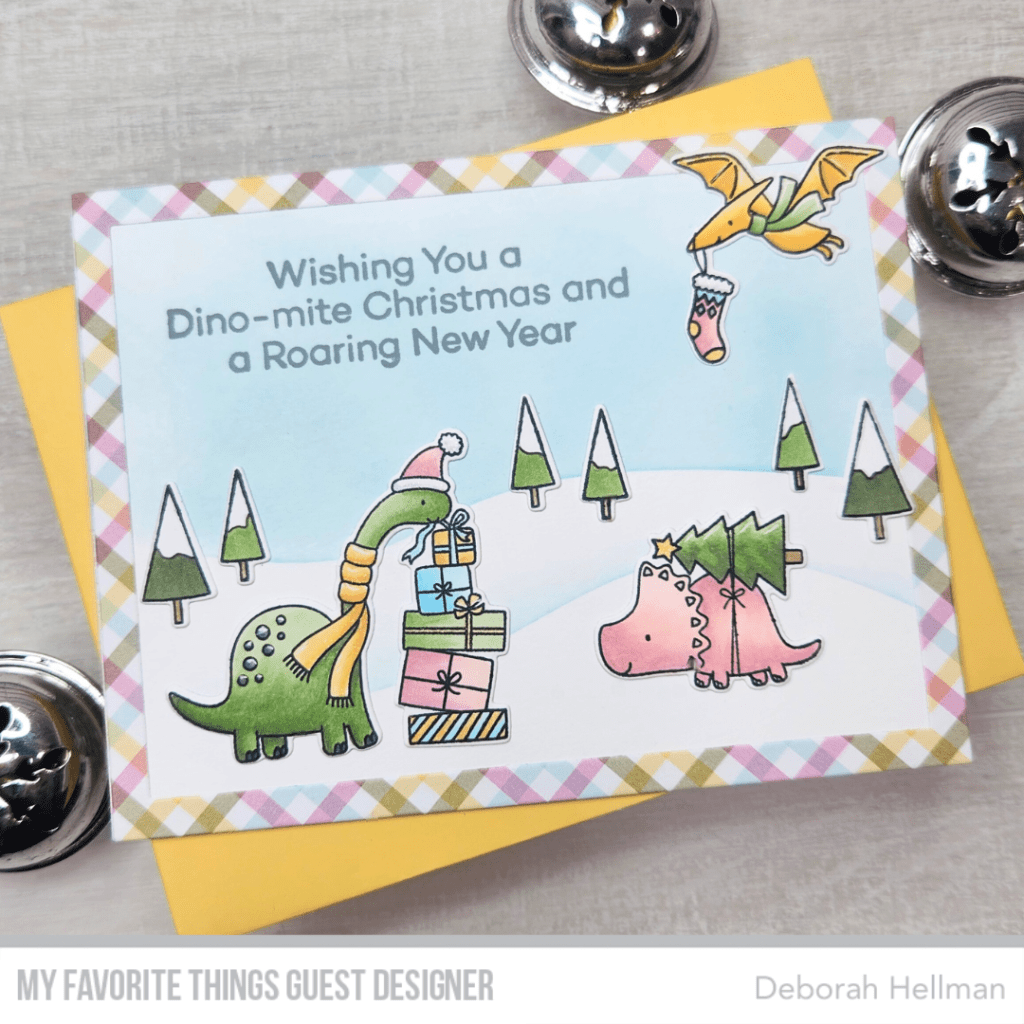 For my Christmas card this month, I decided to use a non-traditional, soft, playful color palette based on the colors in the Joyful Plaid Paper Pad: Sno Cone, Jalapeño Popper, Lemon Drop, and Cotton Candy. The adorable dinos from the Christmas Party Dinos Stamp Set matched up perfectly. I also kept the sentiment light by using Cement Gray Premium Dye Ink instead of black. I ink blended the sky and snow using Tim Holtz Distress Oxide Ink Speckled Egg.