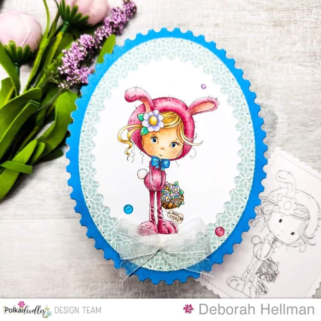 Hello all! Deborah here, and I am working on my Easter cards for my granddaughters. They love everything that’s cute and pink 💕 and this cute Winnie Easter Bunny from Polkadoodles definitely hits the mark!