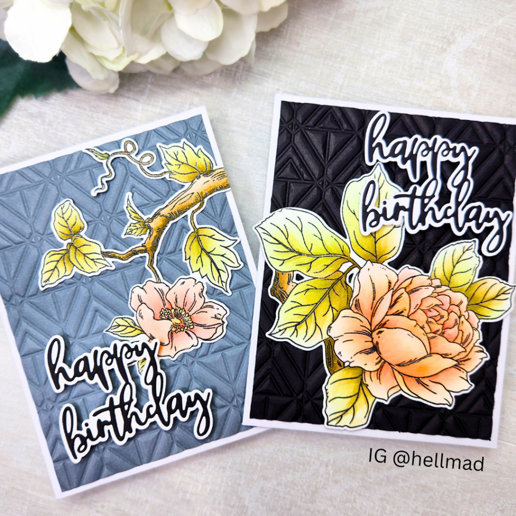 I was super excited to use my Altenew Build-A-Garden: Magnificent Branch stamp, stencil, and die bundle. It is a large stamp, and I was able to make a “twofer” by cutting the finished design in half.