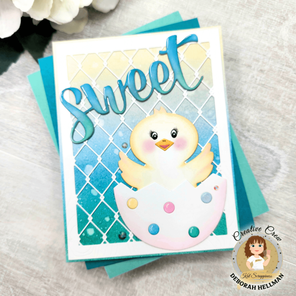 I made this cute card using Kat Scrappiness’s “Just Hatched Craft Die” from the new Easter Release. I ink blended both the background and sentiment using Distress Oxide Inks: Broken China, Evergreen Bough, and Scattered Straw. I also used Distress Oxide inks on the chick and egg: Scattered Straw, Spun Sugar, and Kitsch Flamingo.