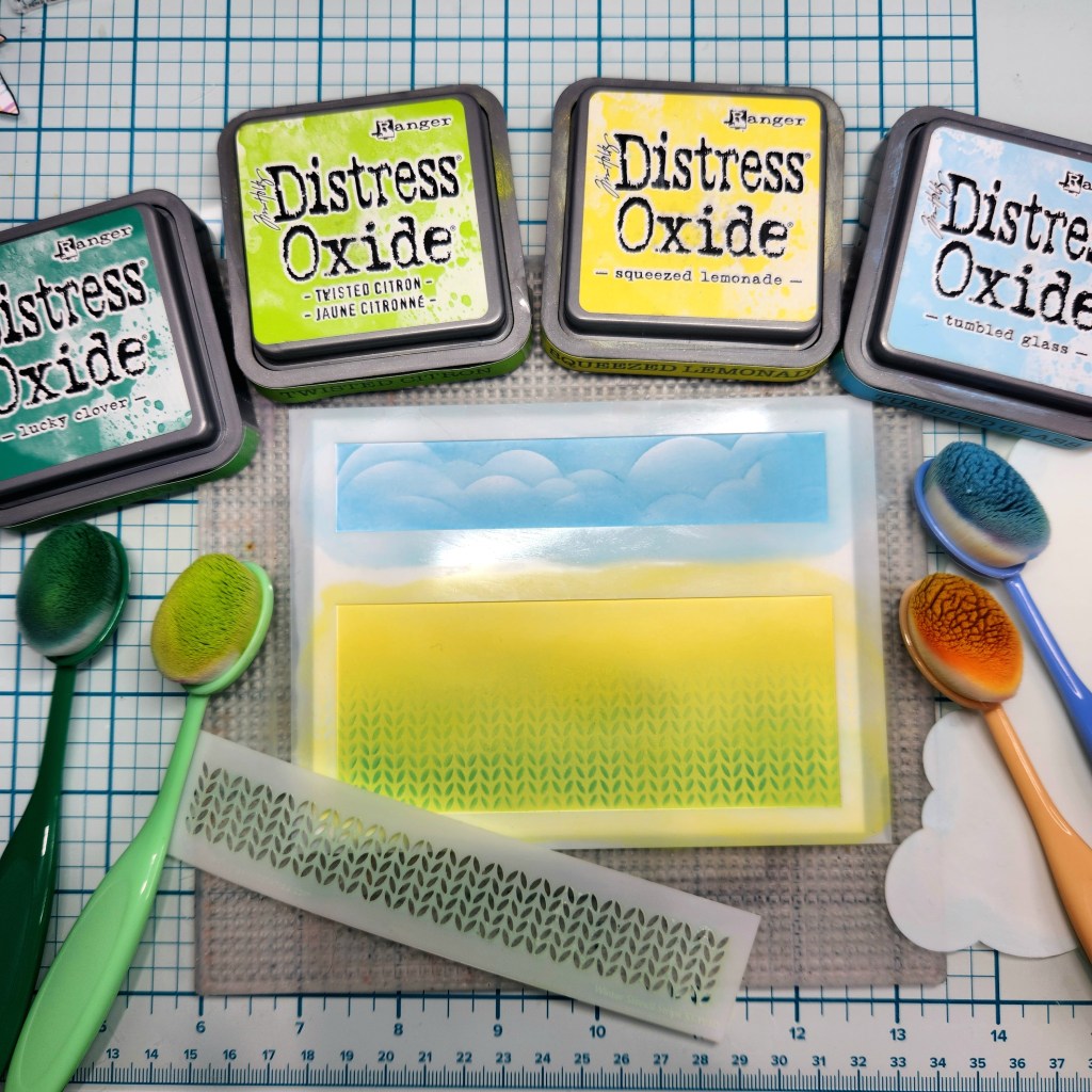 I ink blended the background with Tim Holtz Distress Oxides Inks: Lucky Clover, Twisted Citron, Squeezed Lemonade, and Tumbled Glass. I added some additional interest by double stenciling the bottom section. I used a winter knit stencil to create some faux greenery. All images were colored with Copics.