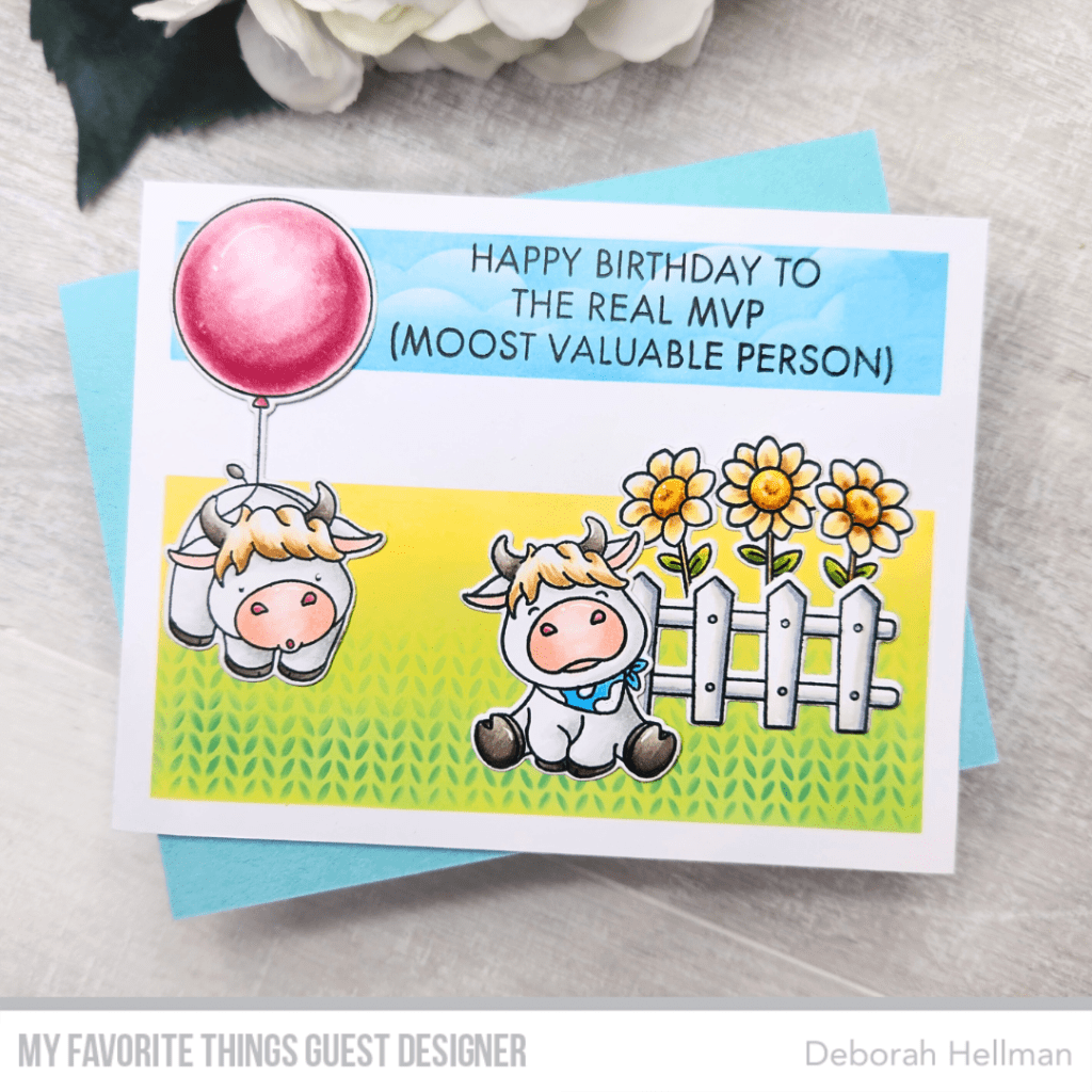 For my second card, I used the YUZU You Make Moo So Happy Stamp & Die Duo and the Smart Mask Horizontal High/Low Strip Stencil. I also used the Cloud Stencil and the Winter Stencil Strips.