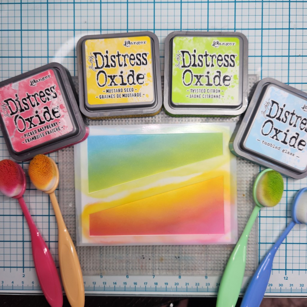 I ink blended the background with Tim Holtz Distress Oxides Inks: Picked Raspberry, Mustard Seed, Twisted Citron, and Tumbled Glass. I added some additional white spatter for interest. All images were colored with Copics.