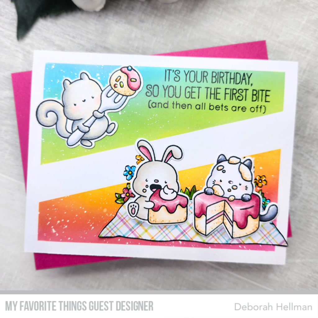 For my first card, I used the JB Birthday Bites Stamp & Die Duo and the Smart Mask Horizontal Diagonal Center Strip Stencil. I also used the table cloth stamp from the JB Tea Party Stamp Set with some paper piecing from the Pretty in Plaid Paper Pad.
