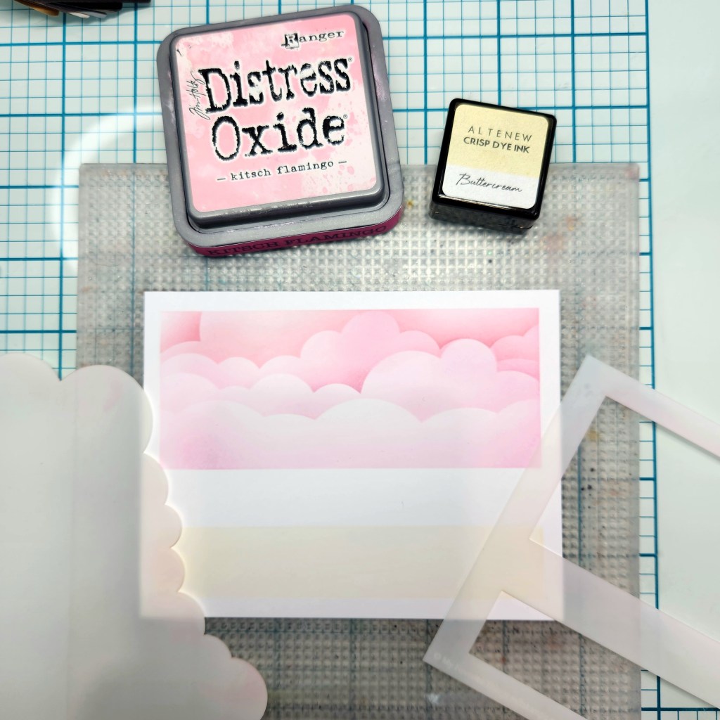 I inkblended the background using MFTStamps’ Smart Mask Horizontal High/Low Strip Stencil, Affiliate shopping links -> https://shrsl.com/4fr51 and Cloud Stencil https://shrsl.com/4fr54