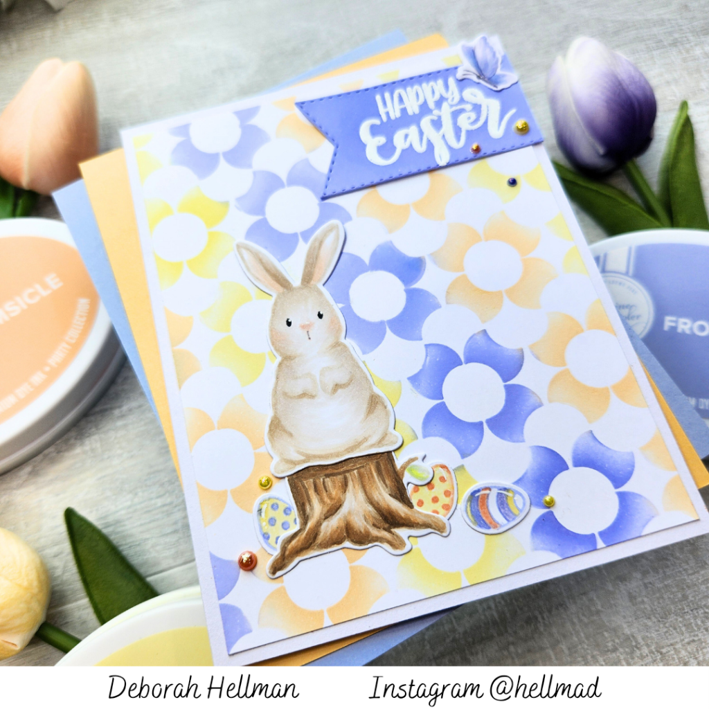 For this sweet Easter card, I ink blended my background using Frosted, Creamsicle, and Lemon Sorbet Premium Dye Inks with the Daisy Duke Background Stencil. I also used the Frosted ink to color a piece of cardstock, and then heat embossed my sentiment on it. This step ensures that I have a perfect match with my background.