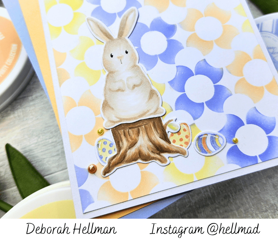 Next, I used the Spring Into Easter Stamp and Die Set to stamp the images. I colored the bunny, tree stump, and butterfly using a no-line technique and my Copic markers. I just love these soft, sweet, new ink colors!