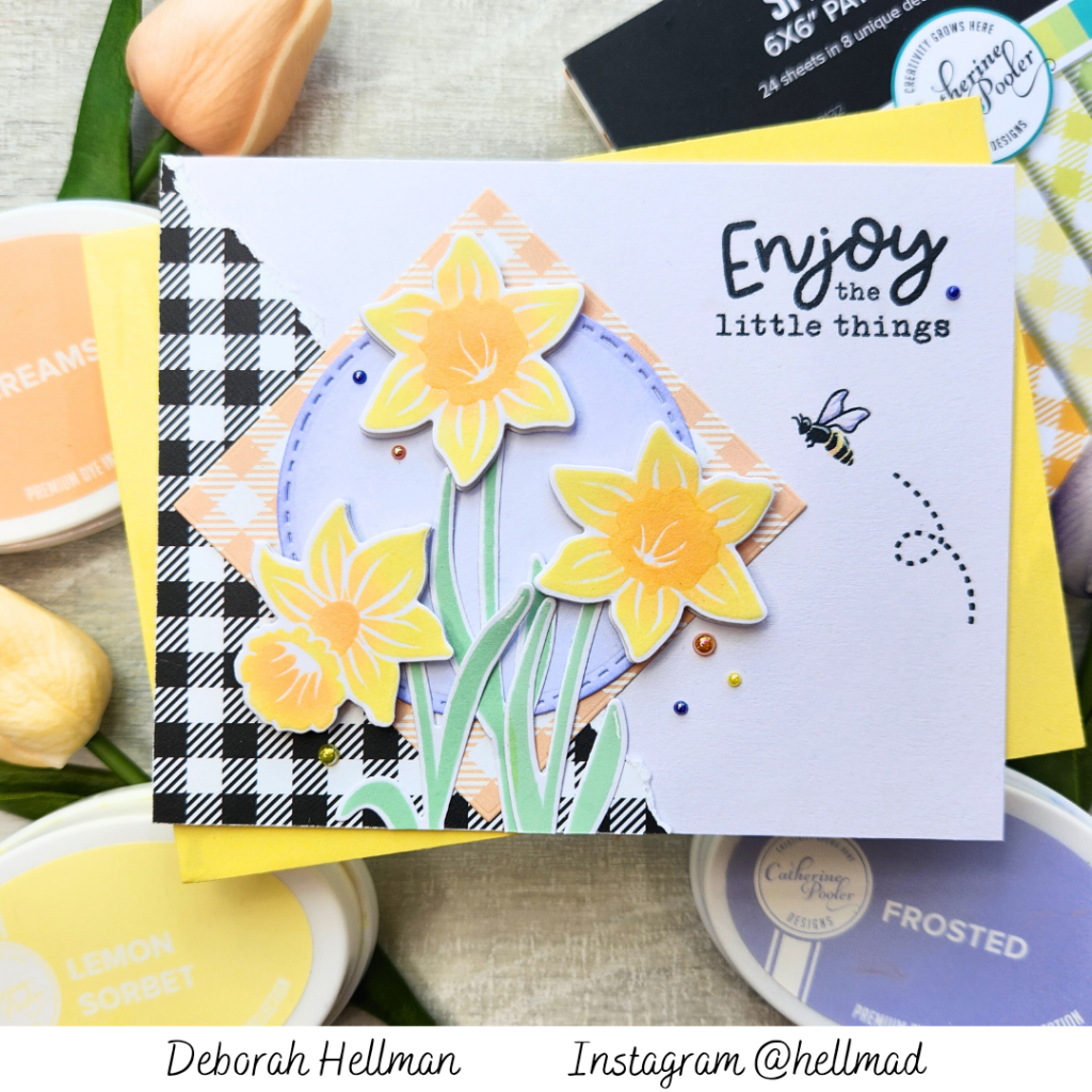 I stamped the leaves with Minted and blended Lemon Sorbet and Creamsicle on the Daffodils. For the bee, I added a little Copic coloring and white gel pen.