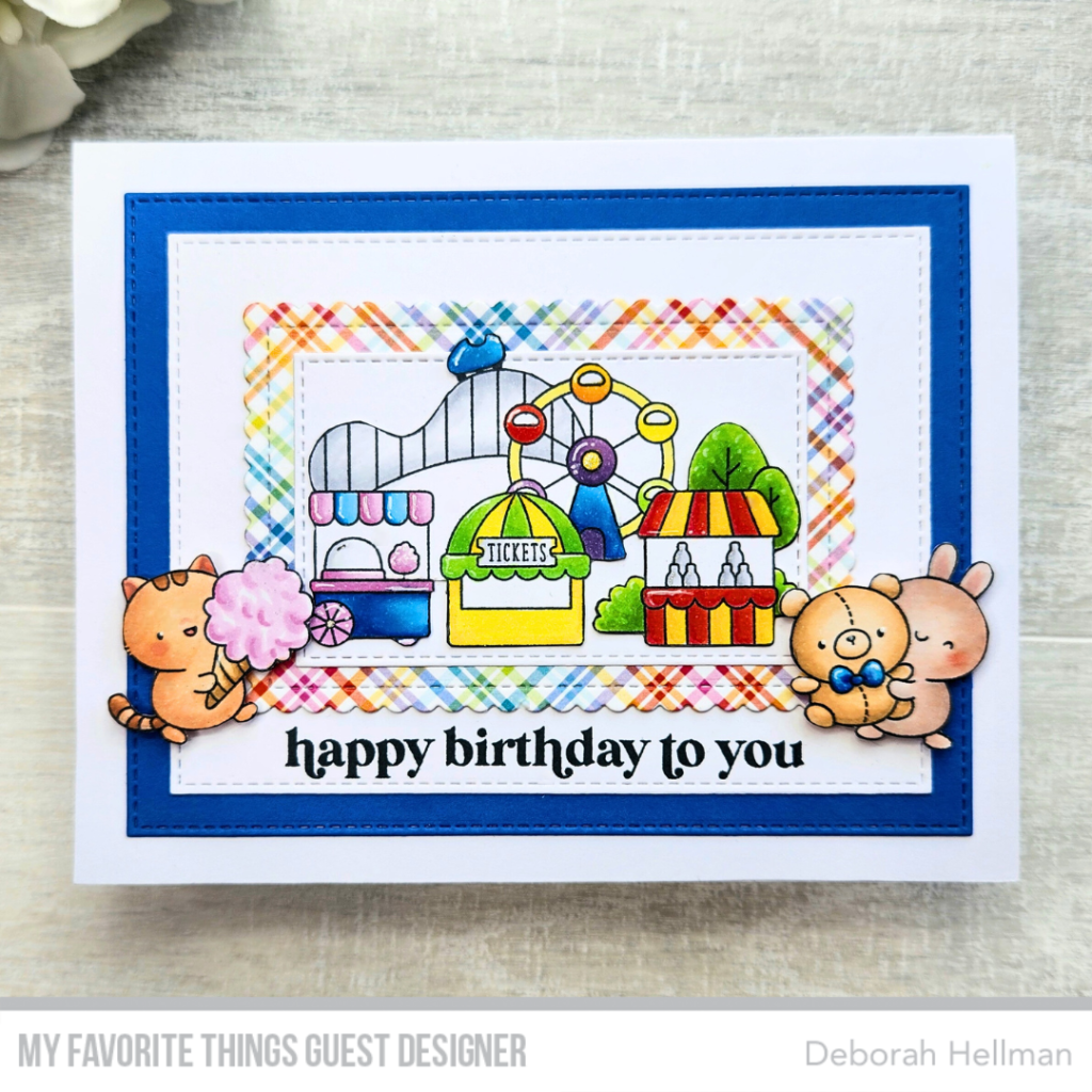 For this week’s challenge, I used Jenoblade’s @jenoblade_ Carnival Critters Stamp Set to create this adorable birthday card. All images were colored with Copic markers. In order to accommodate all of the layers, I made my card ½ inch wider and longer than the normal A2 card. I simply cut down one of my A7 bases to 4¾” x 6″. That way, I could still use all of my A2 frame dies because everything was still in the same proportion.