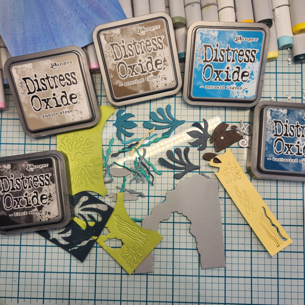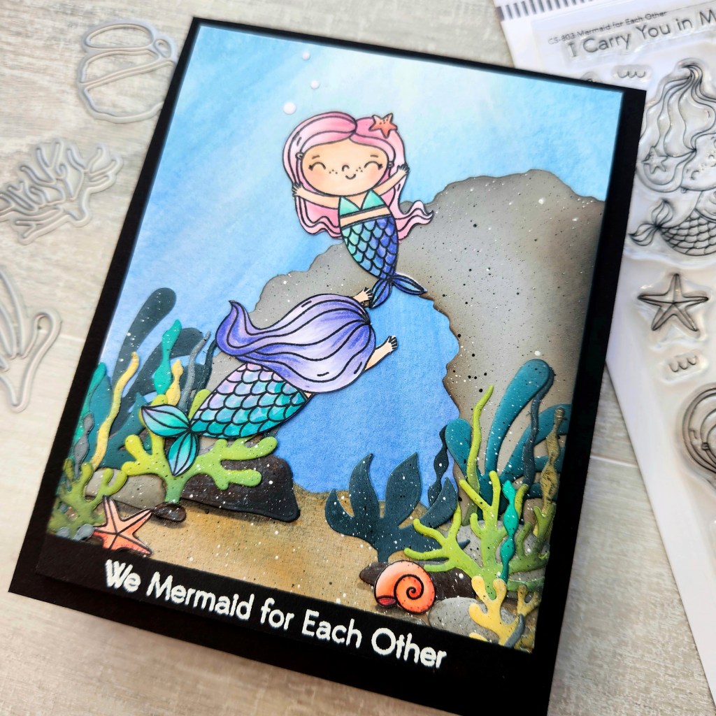 For this week’s My Favorite Things sketch challenge no. 694, I turned the oval into an underwater rock formation using the Under the Sea Die-namics and used mermaids for the diagonal elements. I made a quick watercolor background using Distress Oxide Inks (Prize Ribbon and Chipped Sapphire), ink blended the die-cut pieces (see photo), and colored up the adorable mermaids from Mermaid for Each Other using alcohol ink markers.