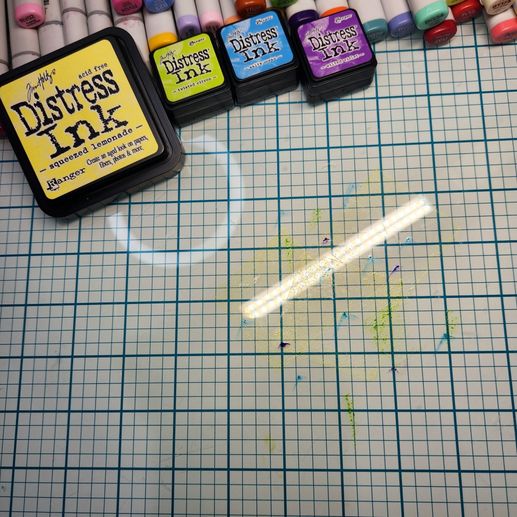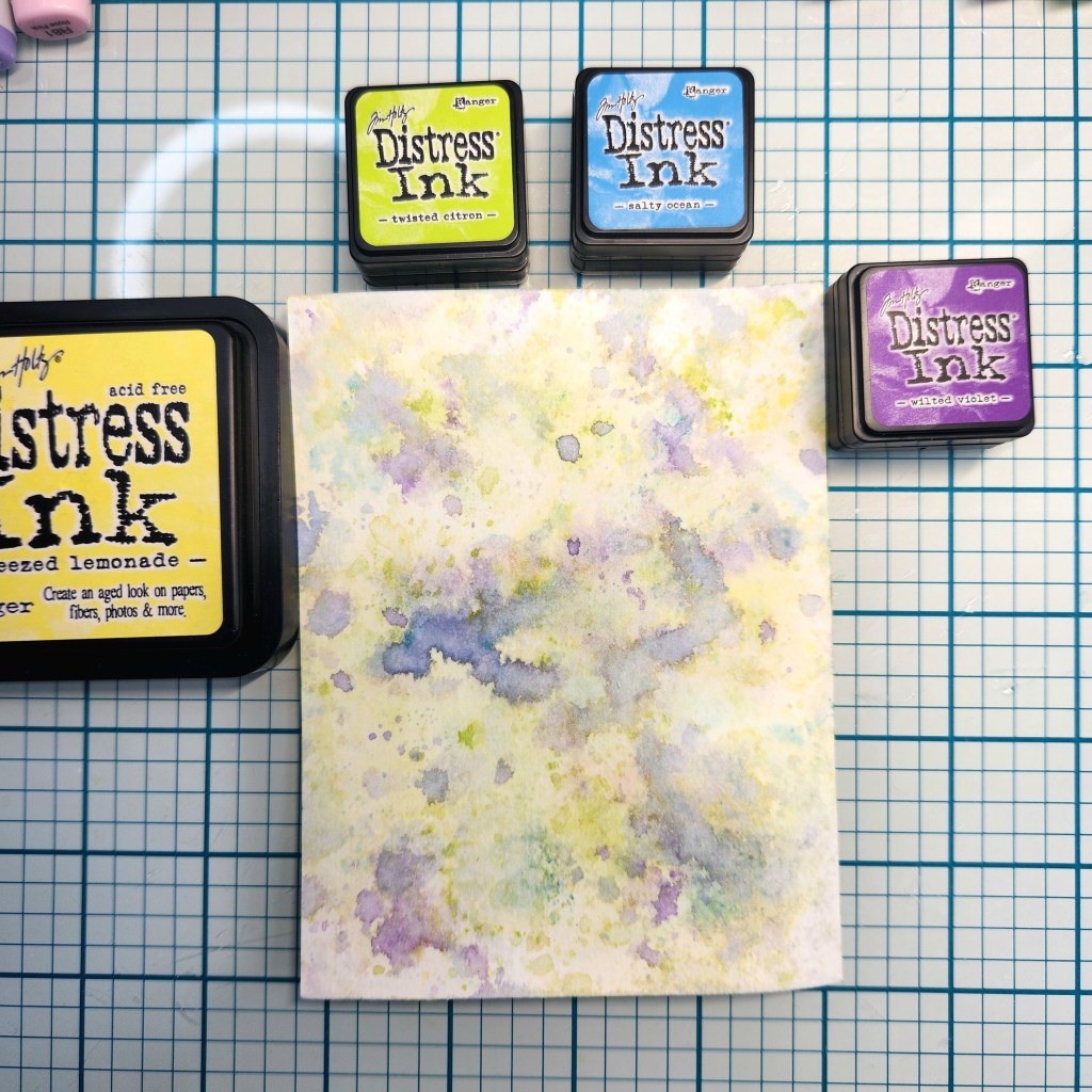 I created the background by smooshing ink pads onto a glass mat, spritzing the ink with a little water, blotting up the mixture with a watercolor panel, and drying between layers. Distress oxide inks used: Squeezed Lemonade, Twisted Citron, Salty Ocean, and Wilted Violet.