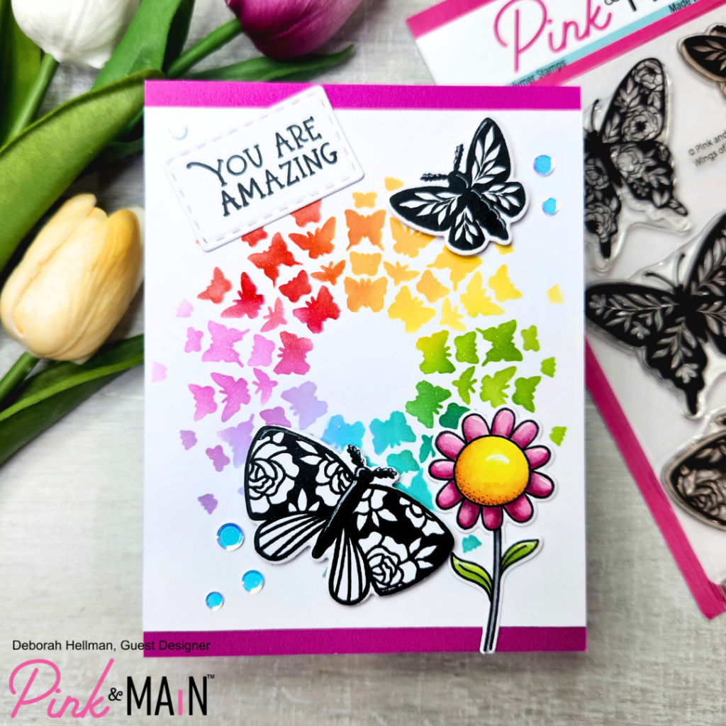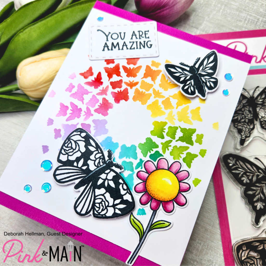 I am super excited to share with you my card #2 as a guest designer for Pink & Main. On this card, I used several of the new April release products. I first worked on the background creating a rainbow of butterflies with the Radiating Butterflies Stencil and blending inks. This stencil has 2 pages with 2 stencil patterns on each page. So you could easily do a mix of 4 colors, one color for each step. I chose to do a rainbow blend which meant that I needed to do the rainbow blend four times to complete the pattern.