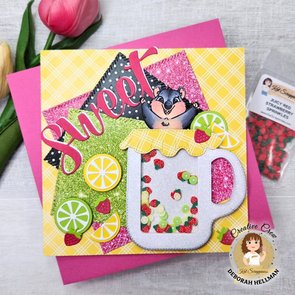Who doesn’t love a fun Springtime/Summertime shaker card? I created this cute quokka shaker card using the Kat Scrappiness Mason Jar Shaker Die Set and fun citrus and strawberry sprinkles.