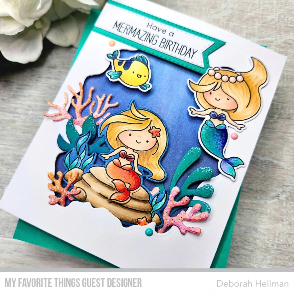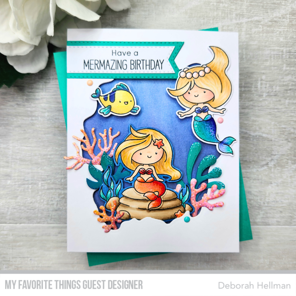 I made this cute mermaid birthday card using the new JB Fintastic Friends Stamp Set. I also added in some sea plants from the Under the Sea Die-namics Set and used the Watercolor Wash Free Form Die-namics for my frame. I watercolored the background using Tim Holtz Distress Oxide Inks.