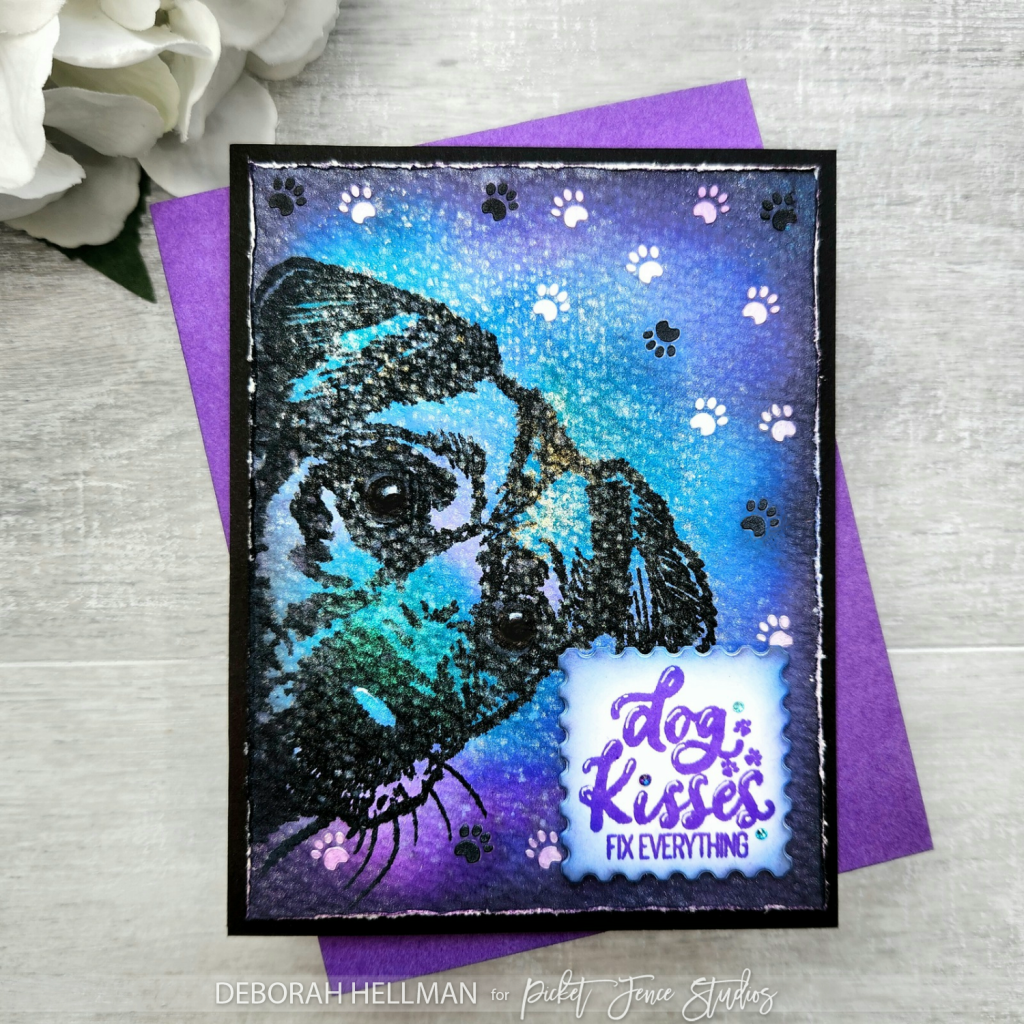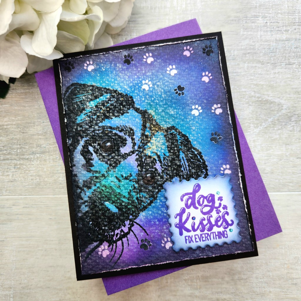 Today, I am sharing with you my second Picket Fence Studios card from the new Paws and Prints Release. I had fun creating this mixed media card. For the background, I began with some shimmer and ink sprays on watercolor paper and then stamped the dog face using the new “You Hold My Heart in Your Paw” Stamp Set [ https://collabs.shop/v95nep ]. I darkened the eyes with a marker and added a little white highlight to make them stand out. I wanted him to look out and touch your heart. Then, I stenciled the paw prints around the edges using the “Fetch Layered Stencils” [ https://collabs.shop/3phfcq ] and black and white glaze from the “Paper Glaze Canines Sampler Set” [ https://collabs.shop/act551 ]. Let me tell you… this was my first time using the regular Paper Glazes, and they are sooo smooth and easy to work with! I love them so much, I ordered more. 😁