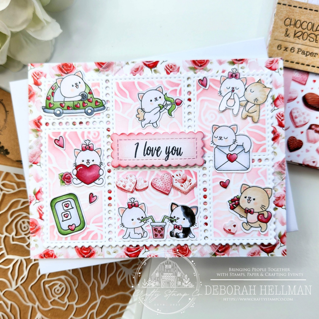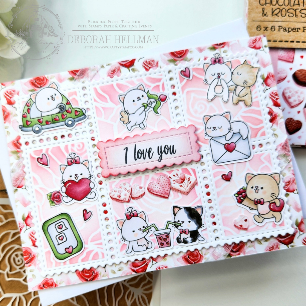Today, the design team will be showcasing the new Kitten & Kisses Stamp Set, which I paired with the Chocolate & Roses Paper Pad, Love & Coffee Stamp, and Lovely Roses Stencil.