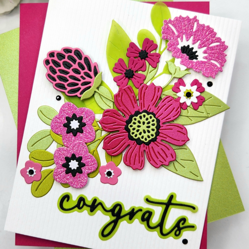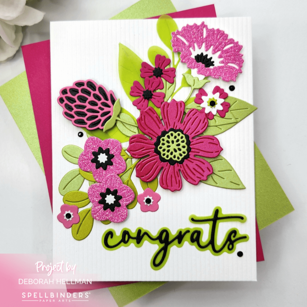 I created this lovely pink and green floral using Spellbinders’ Vivid Blooms Etched Dies ->