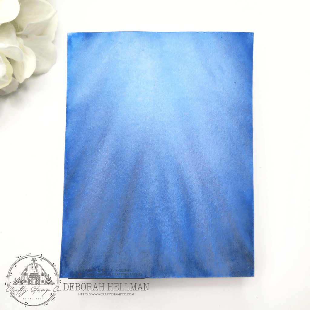 First, I created a quick watercolor ocean background using Chipped Sapphire, Blueprint Sketch, and Prize Ribbon Distress Oxides. I stamp the ink pad onto my glass desktop, spritz with water, and paint with the diluted dye inks. I purposely left some lighter streaks at the top to represent sunlight shining through the water.