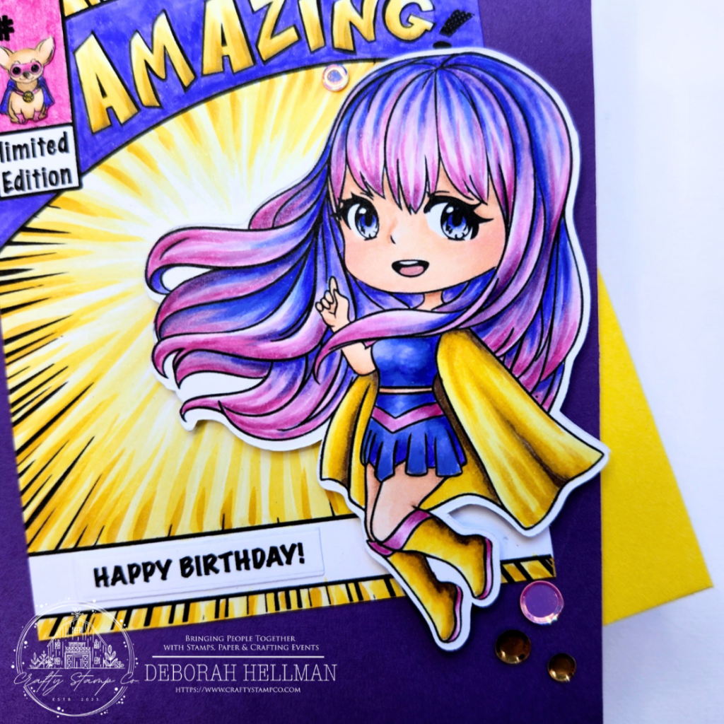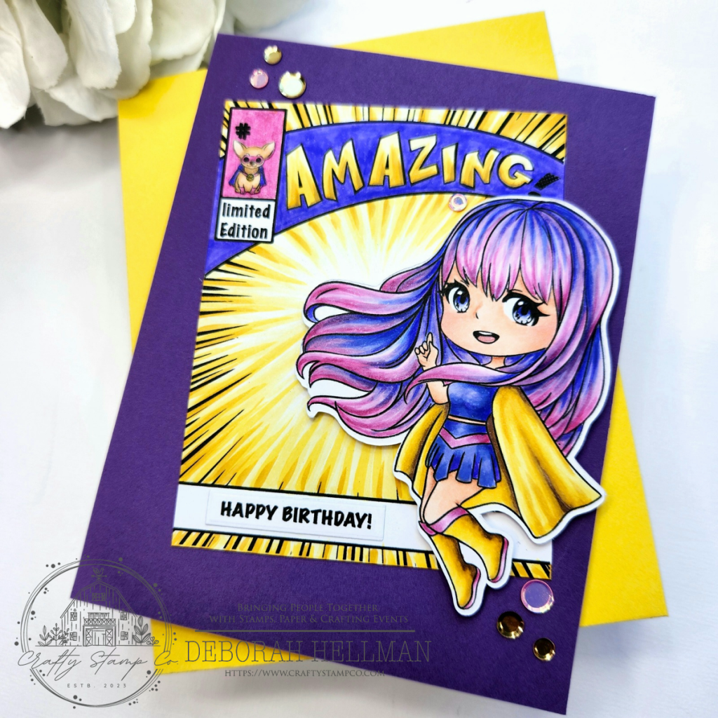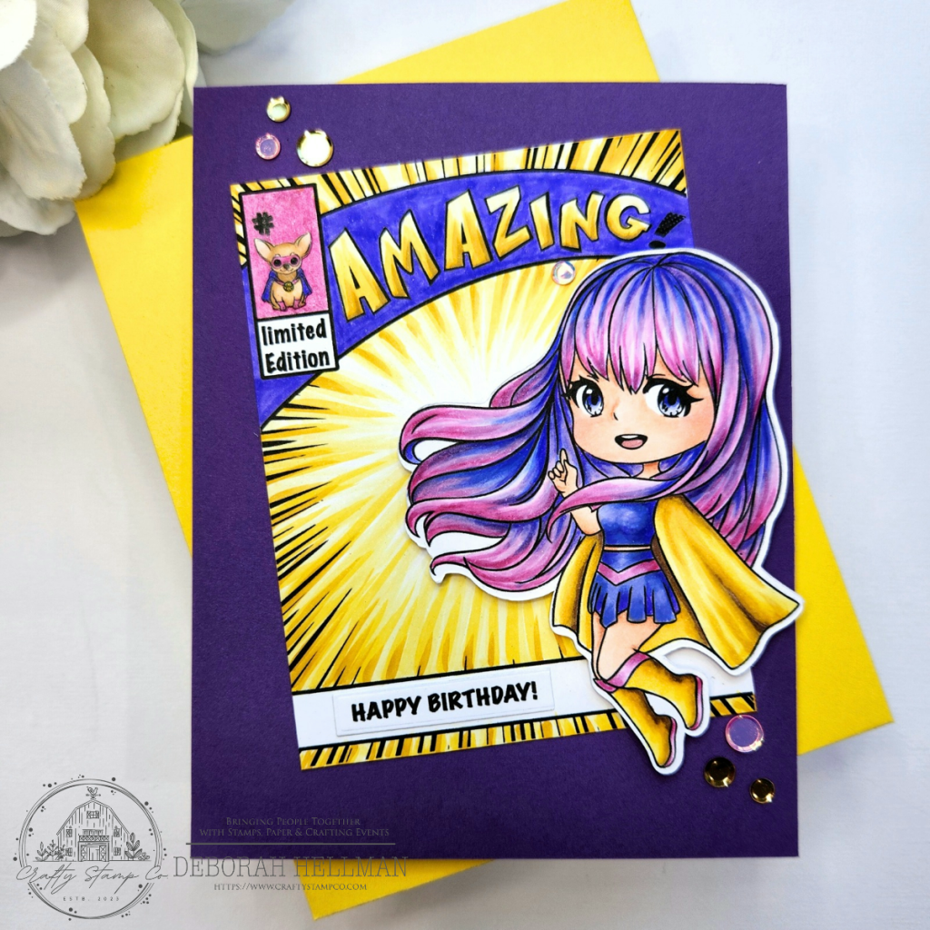 Hello all, Deborah Hellman here to share with you my SUPER fun A2 birthday card using Crafty Stamp Co.’s new Wonder Girl Meadow, Wonder Girl Gracie, and On the Cover Stamp Sets.