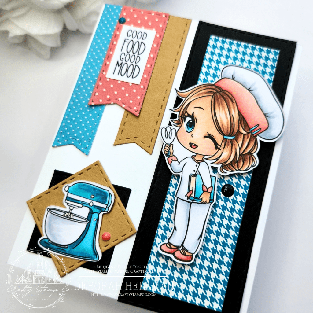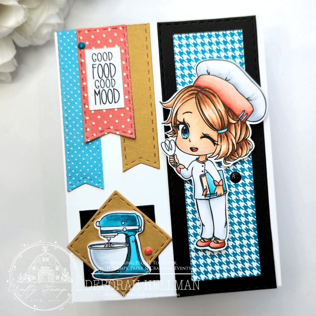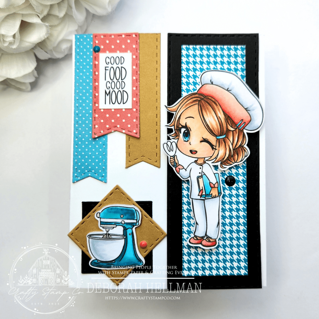 Once I had the shapes cut and the layout complete, I stamped out the cute chef and mixer using the Patissier Meadow Stamp Set and the sentiment from the Sou-ee Chef Stamp Set.