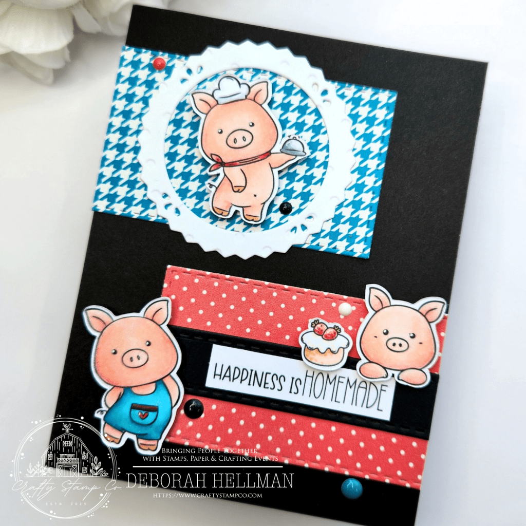 Once I had the shapes cut and the layout complete, I stamped out the cute pigs and dessert using the Sou-ee Chef Stamp Set and the sentiment from the Patissier Meadow Stamp Set.