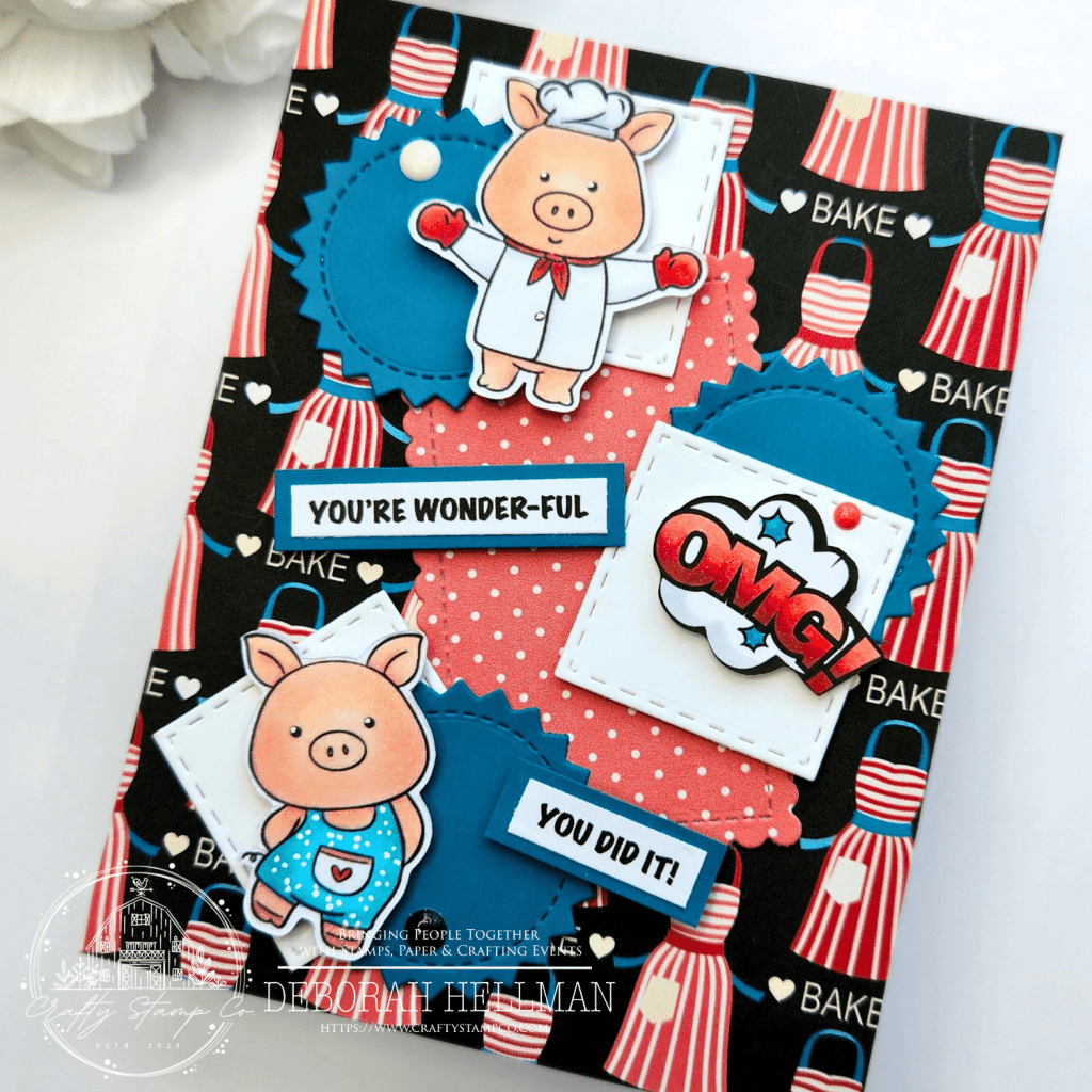 Once I had the shapes cut and the layout complete, I stamped out the cute pigs using the Sou-ee Chef Stamp Set and the sentiments from the Super Sentiments and On the Cover Stamp Sets.