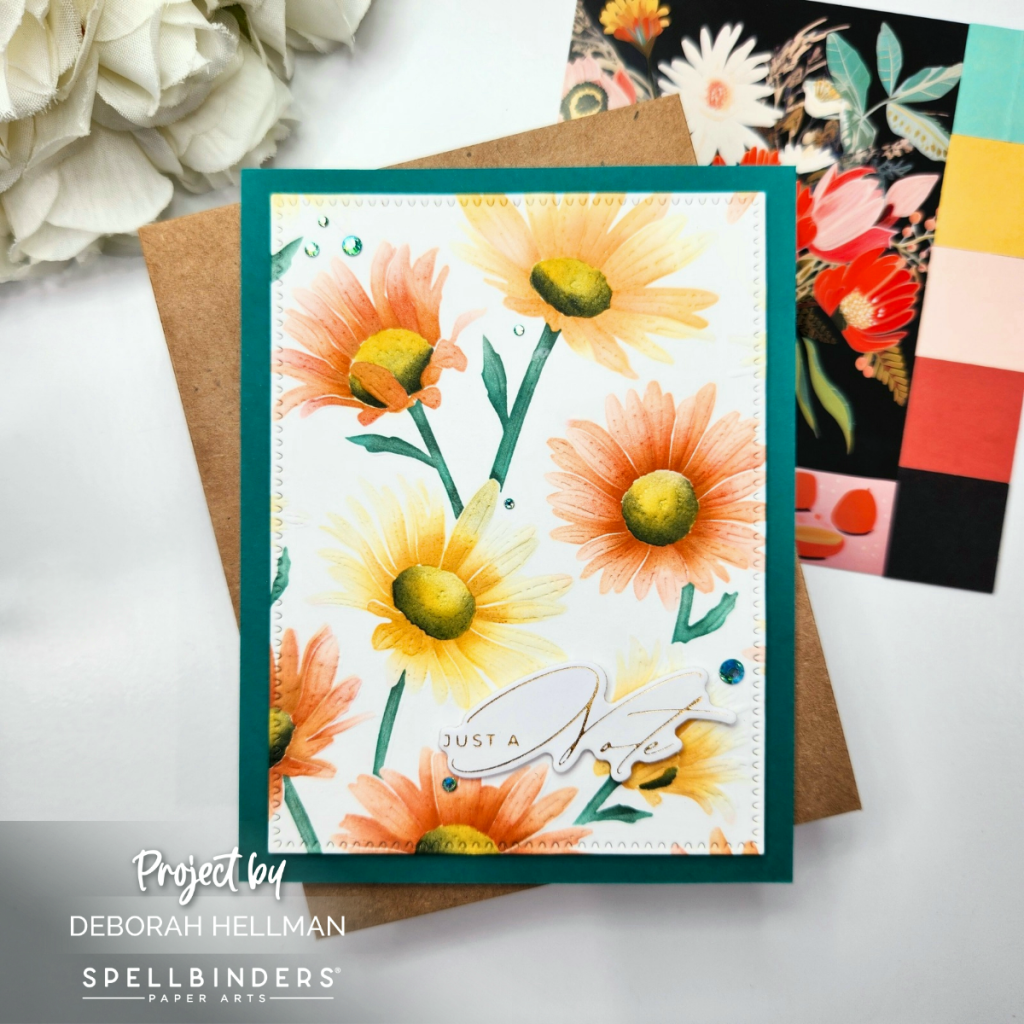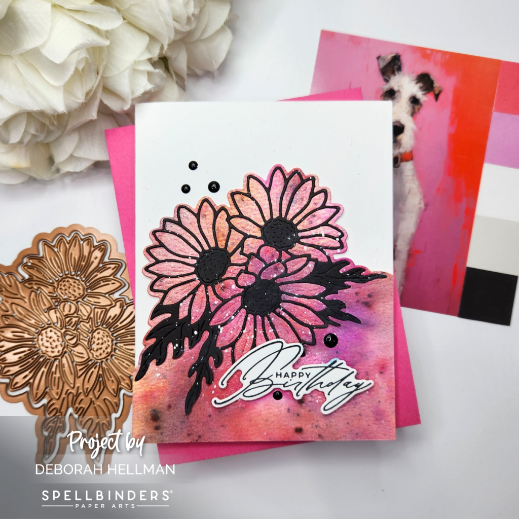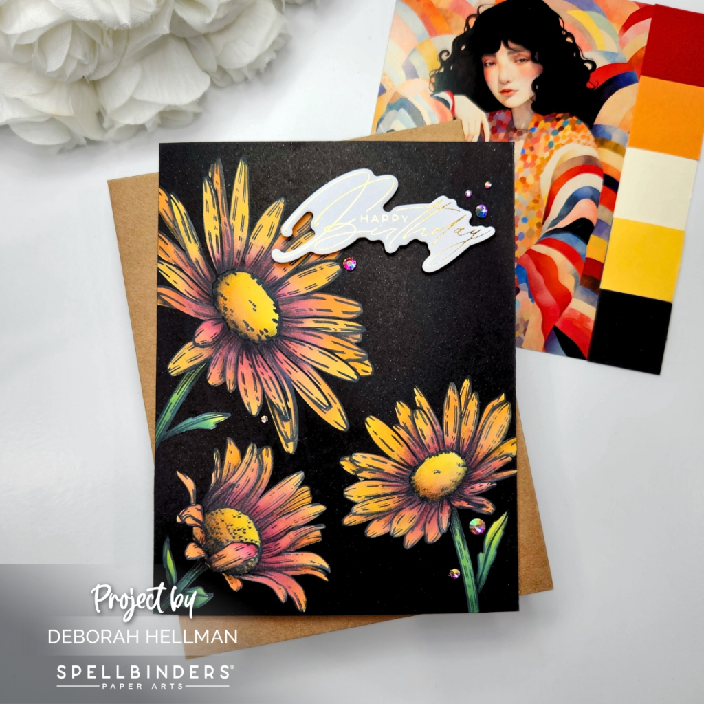 For this card, I used the same Yana’s Daisies Etched Dies and sentiment set. However, this time, I used the outline die to partially die-cut my background, thus creating an organic division line between my upper and lower halves. I created the pink and orange background using Lindy’s Magicals and watercolor paper. I took my color inspiration cue from the DIY Color Deck; the color deck is an outstanding creative tool. It is perfect for ideas and to encourage you to try new color combinations. After the partial outline was cut, I embossed the background with Yana’s Daisies Etched Dies so that I would have petal details in my lower layer. Then, I used the same die a second time with black cardstock so that I would have lots of contrast when I layered the black die cut on top of my embossed paper. I finished the card by adding some white splatter, a pressed sentiment, and a few enamel dots.