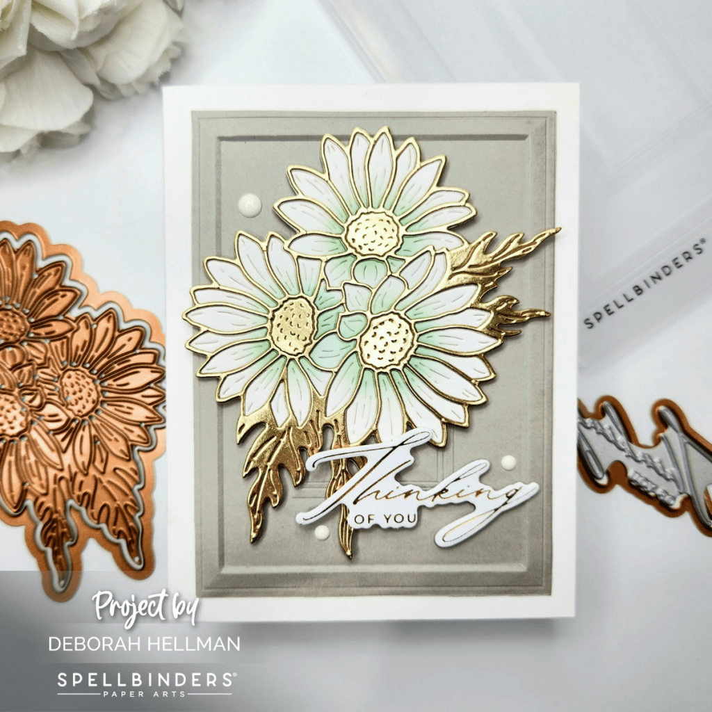 For this first card, I used Yana’s Daisies Etched Dies, Molded Frame 3D Embossing Folder, and Crafty Hugs Sentiment Press Plates and Dies. I kept the design and colors classic with white, gold, neutral gray, and a pale green. For the focal floral, I used the floral die to cut both a white and gold layer, using the gold layer on top for the leaves, centers, and outlines. I heat foilded the Crafty Hugs Sentiment Press Plate with gold foil and added a few embellishments.