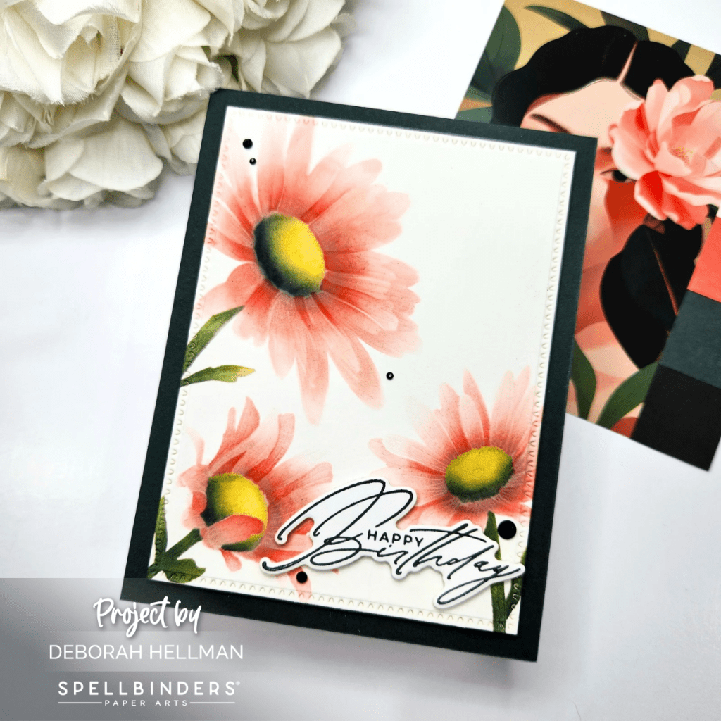 On this card, I used the same press plates and stencils as the previous card, but this time, I used the press plate to emboss a plain white cardstock panel before stenciling my daisies. I used some softer ink colors and added a little Distress Oxide Black and White with a micro blending brush at the end to soften the look of the flowers even more. My color inspiration came from another DIY Color Deck card.