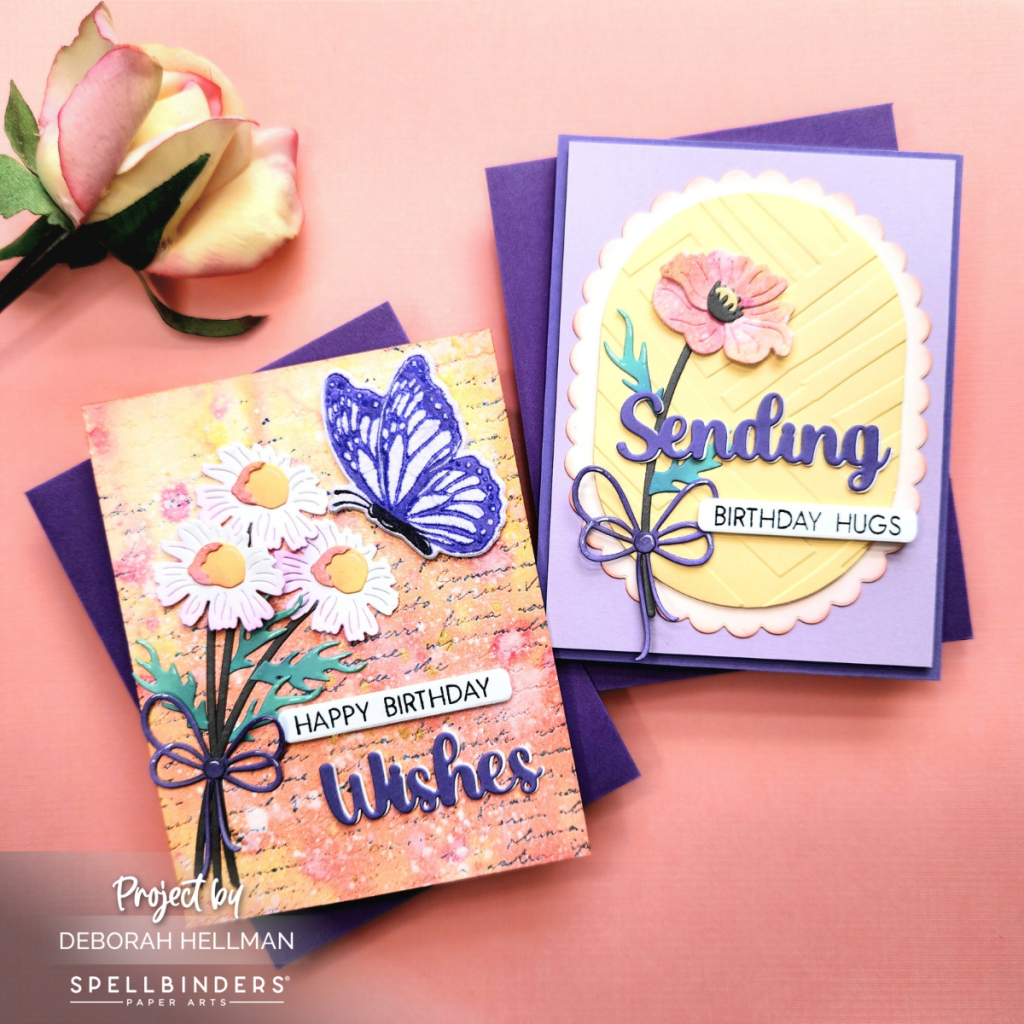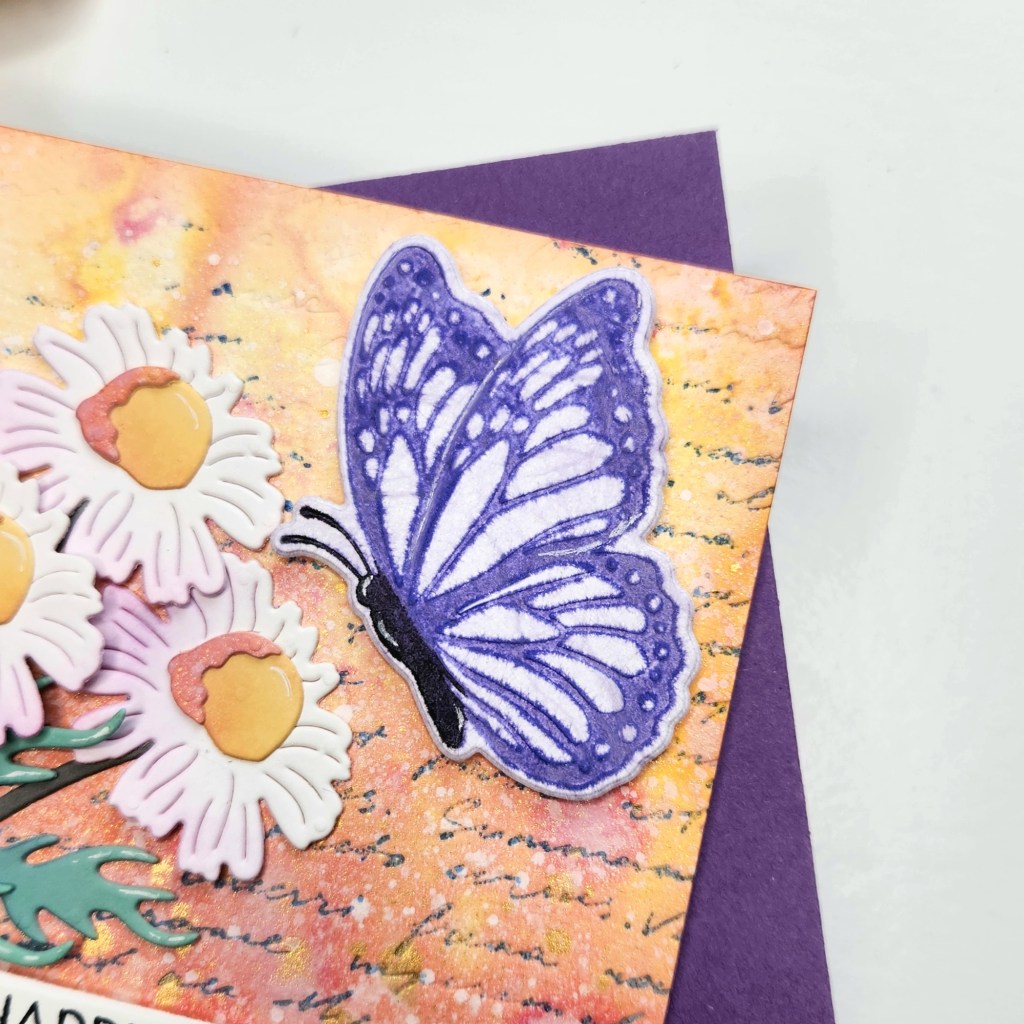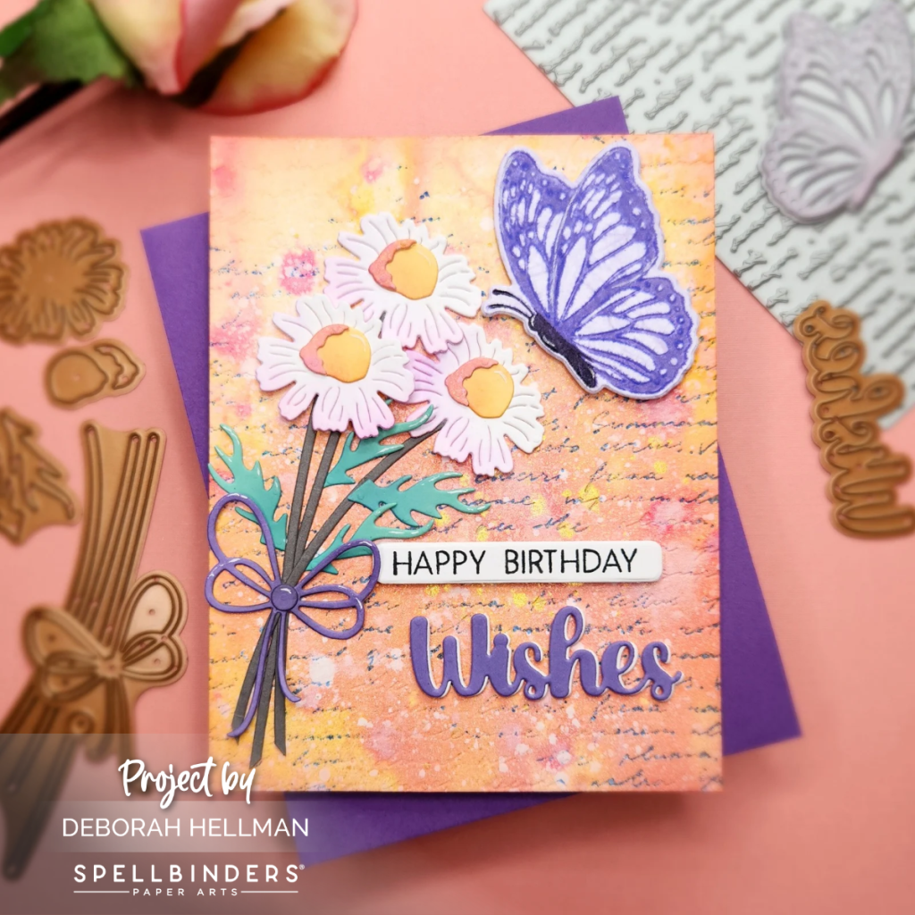 For the first card, I used some Tim Holtz sprays to create my background. Then, I used the Script Text BetterPress Plate and BetterPress Ink to add some additional color and texture. Next, I die cut some florals using the Layered Wildflowers Die Set and printed and cut my butterfly using the Butterfly Silhouettes BetterPress Plate and Dies. After adding some additional ink blending to my pieces, I assembled the card and added a sentiment using the Script Text BetterPress Plates and Dies.