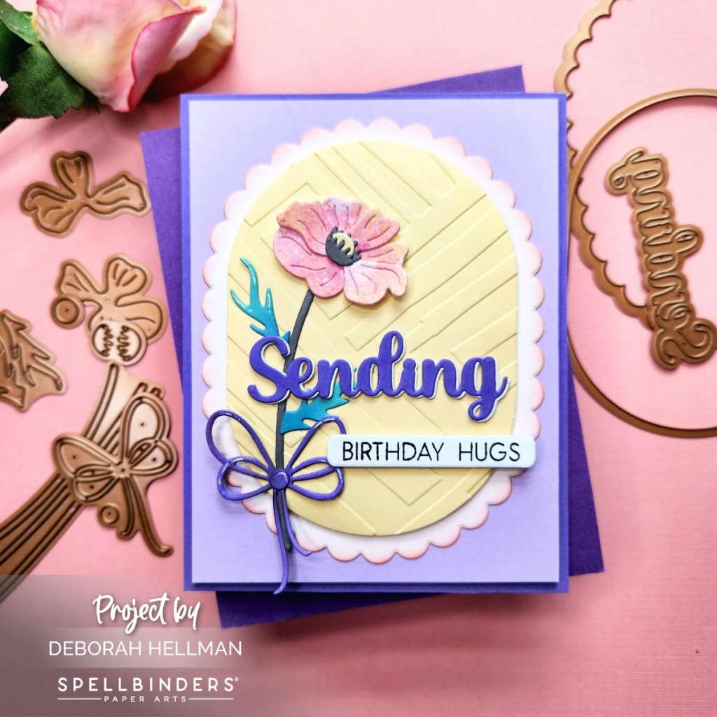 For my second card, I used Lisa Horton Craft’s Layered Wildflowers Dies, Scallop and Stitched Edge Ovals Dies, and the Sending Smiles Sentiment and Die Set. I cut my flowers from a leftover piece of watercolor paper that I had sprayed with yellow, coral, and pink colors. I also added a little embossing to one of the layers using the Spellbinders May Embossing Folder of the Month (Abstract Study).