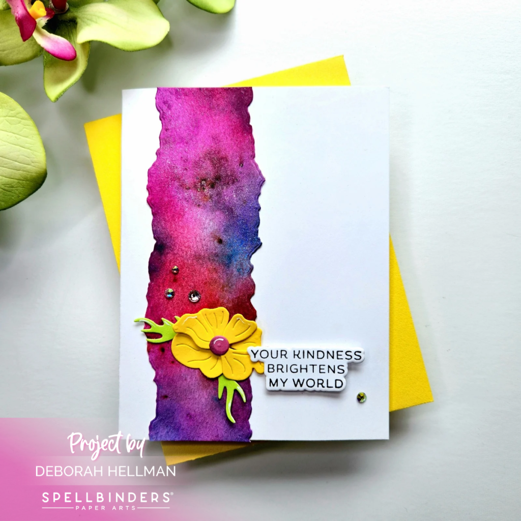 For my final card, I used a leftover strip of watercolor paper that I had sprinkled with pink, blue, and purple Lindy’s Pigment Powders. I cut the edges with the Take Note – Torn Paper Dies. For my focal, I cut a bright yellow flower using Lisa Horton Craft’s Layered Wildflowers Dies and Spellbinders Cardstock. I finished it off with a Take Note – Reel Color Sentiment.
