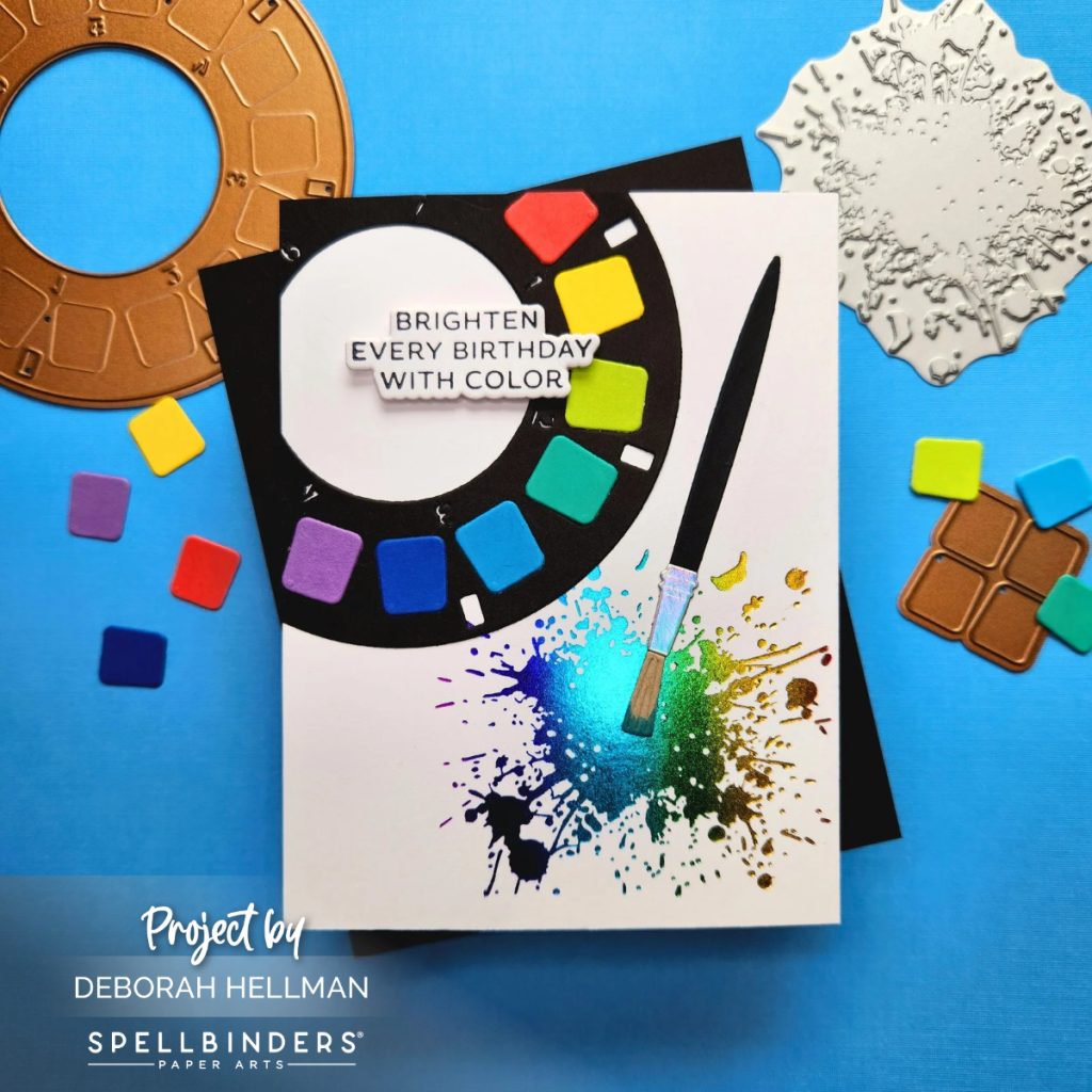 For this next card, I combined several products. In addition to hot foiling Lisa Horton Craft’s Splatters Press Plate with Glimmer rainbow foil, I also used the Take Note – Reel Color Die and Sentiments and the Crafty Babe – Crafty Tools. All of the cardstock used was from Spellbinders.