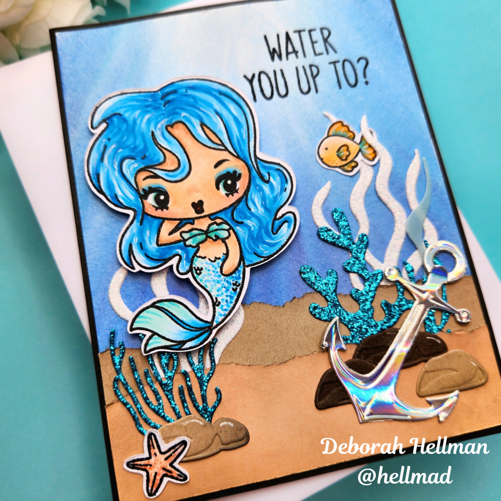 Then, I was ready to assemble my card. After I attached the watercolor paper to my base and the ripped Kraft paper along the bottom, I stamped my sentiment and glued my rocks, sea life, and anchor in place. I used some foam adhesive under my mermaid to help her stand out as the focal and then glued the rest of the images in place.