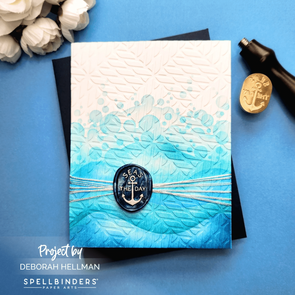 For card above, I used the June Wax Seal, Stencil, and Embossing Club of the Month Products. First, I ink blended a cardstock panel with several blue inks and the June Sencil of the Month, Rolling Tide, before dry embossing with the June Embossing Folder of the Month, Mariner’s Weave. Next, I used the June wax beads to create the “Seas the Day” wax seal. After the wax seal was cool, I used a silver metallic Posca Marker to go over the letters. Now, I was ready to assemble. I wrapped the bottom with some silver metallic DMC thread before adding my wax seal on top. I then adhered the panel to my cardbase. These products make a beautiful card with lots of texture that comes together quickly.