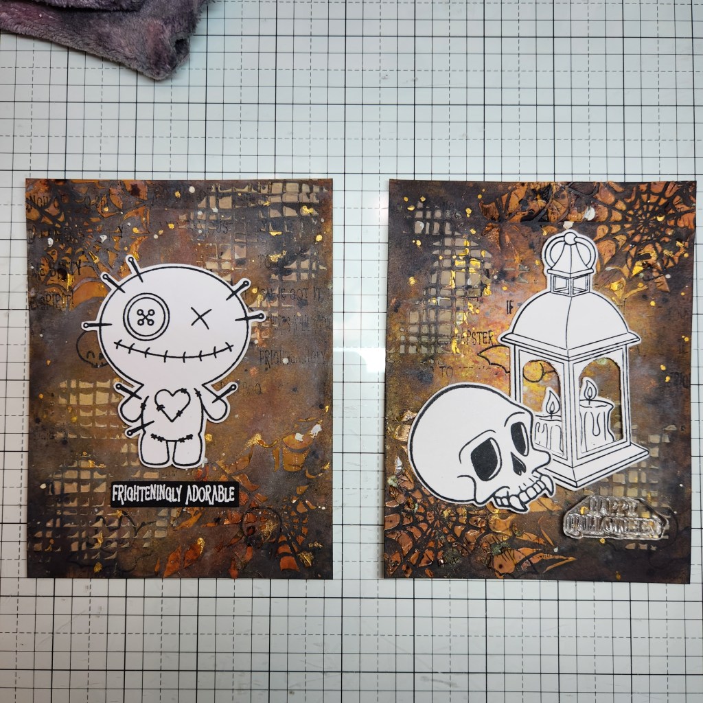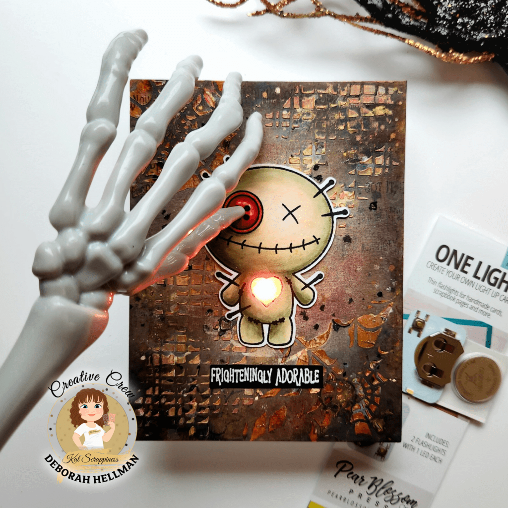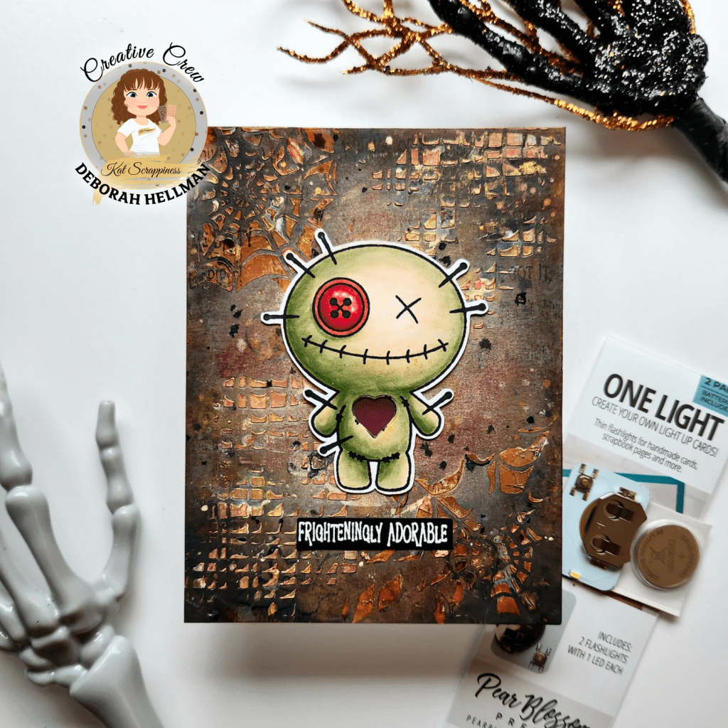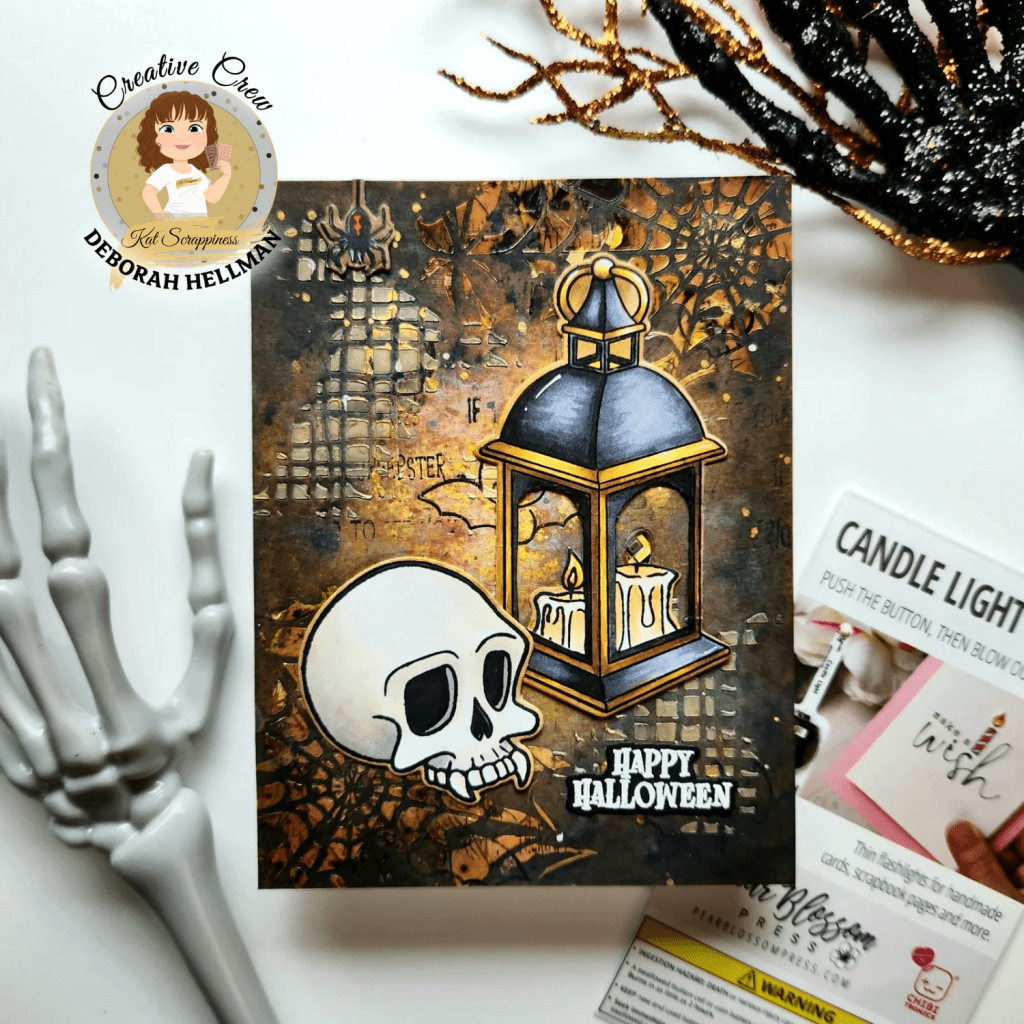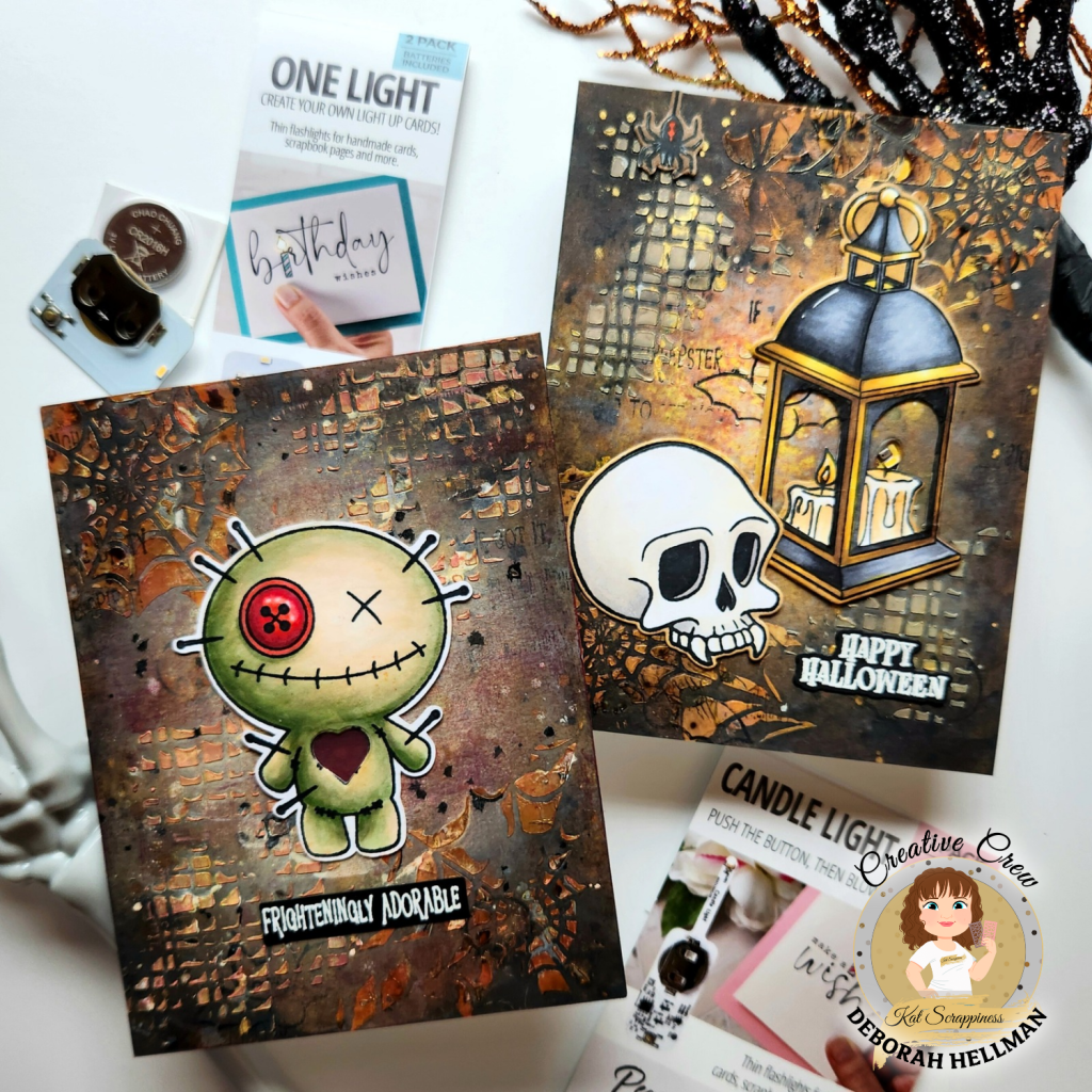 Do you love interactive cards? I created these spooky mixed media Halloween cards that light up using Pear Blossom Press lights that are now available at KatScrappiness.com . These cards feature the Stick it to Me!, Holiday Lantern, and Halloween Lantern Add-on Stamp Sets that I colored using OLO Markers.