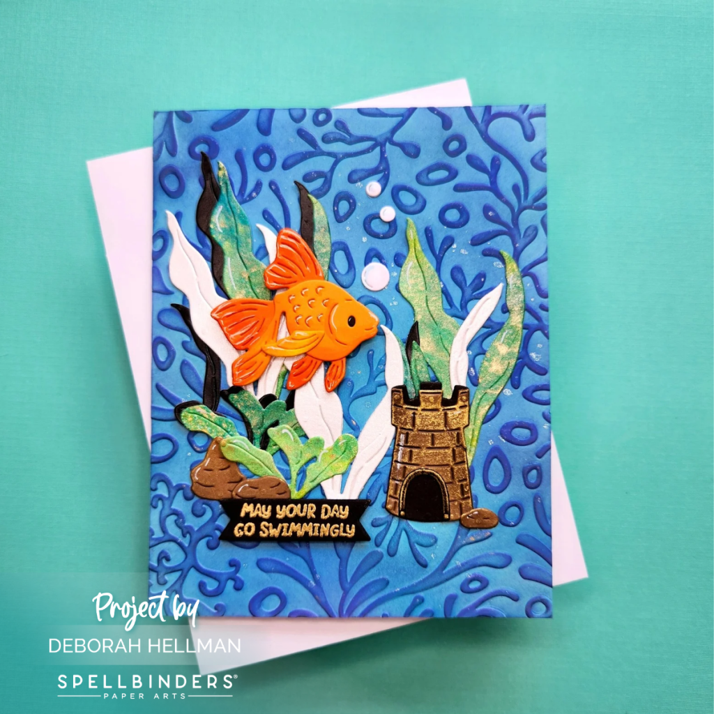 For my final card, I again used the Large Die of the Month – Splash Tales and Embossing Folder of the Month – Coral Impression. After embossing the background, I added some additional ink blending to help emphasize the embossed coral pattern.
