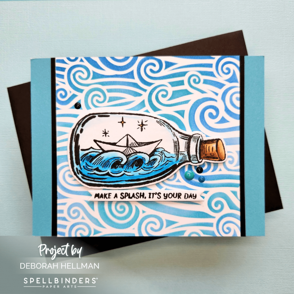 For my third card, the sailboat in the bottle and sentiment are from the current August Clear Stamp and Die Club – Paper Splash. For the stenciled background, I used the June Stencil of the Month – Rolling Tide. I ink blended three different blues to get the effect that I wanted. I also decided to trim my background down a half inch on each side and add a small strip of black cardstock to add a little interest. The water and bottle were colored with alcohol ink markers.