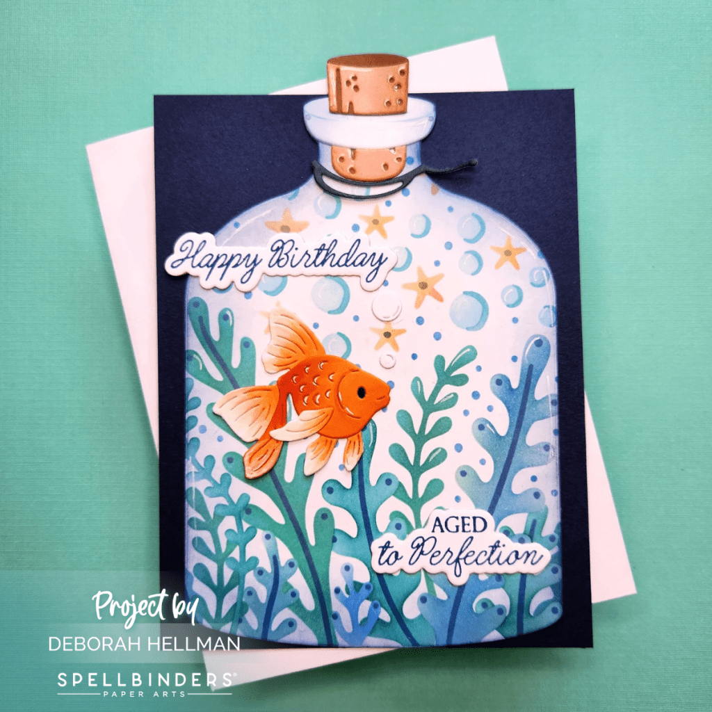 The first card above features the Stencil of the Month – Underwater Bloom and Large Die of the Month – Splash Tales Sets. After stenciling my cardstock panel, I cut it out using the Whale in a Bottle Large Die Set. I added the sweet goldfish from the Large Die Set and sentiments from the Birthday Wishes Sentiments Set.
