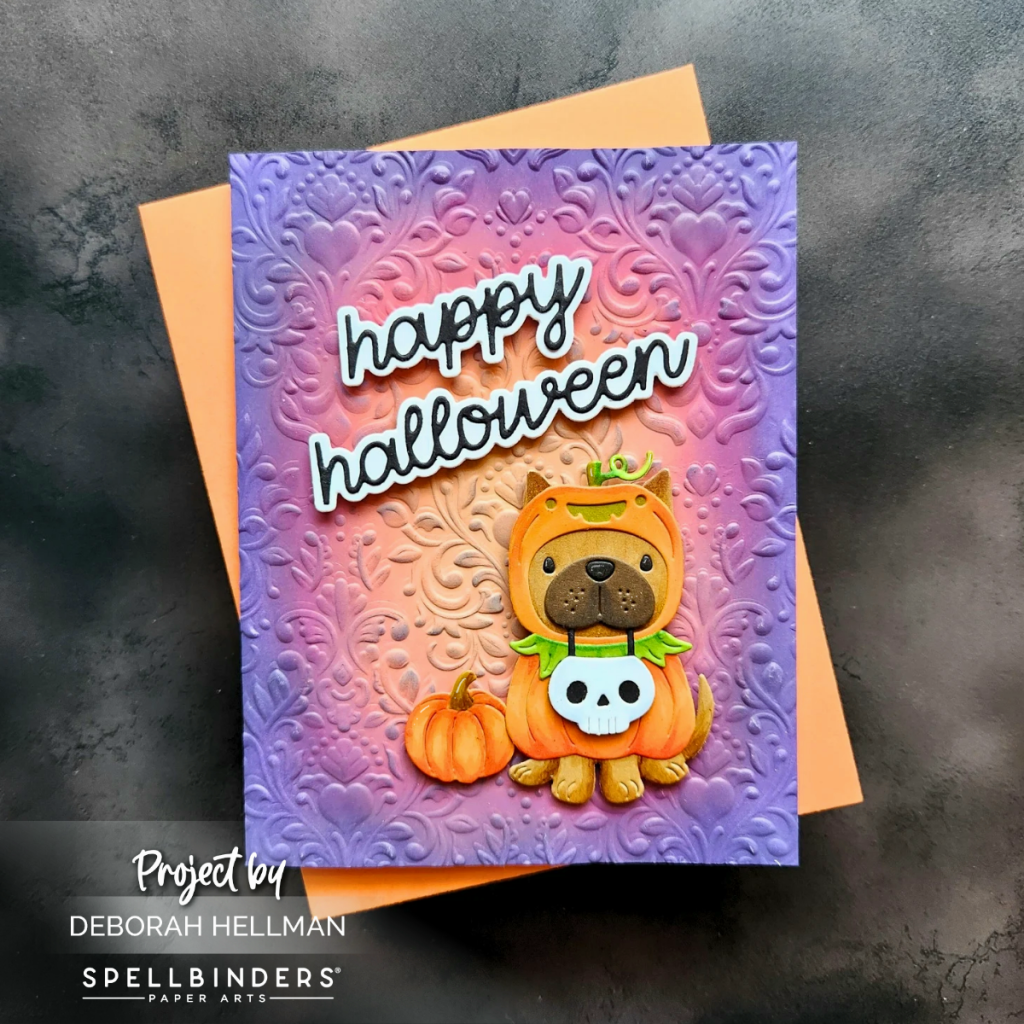 My third card features the adorable Pupkin by Spellbinders. I created the background using the Damask 3D Embossing Folder by Simon Hurley. I ink blended the background using Distress Oxide Inks: Villainous Potion, Abandoned Coral, Wild Honey, and Fossilized Amber. The sentiment came from the Bewitched Etched Die Set, and the extra pumpkin came from the Autumn Greetings Wreath Etched Die Set. I also added a little dimension to my die cuts using alcohol ink markers.