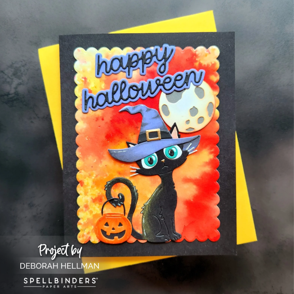 My second card features the Bewitched Etched Die Set. I just love this cat. I added a moon from the To the Moon Set by Simon Hurley. I created the background using Lindy’s Gang Magical Pigment Powders.