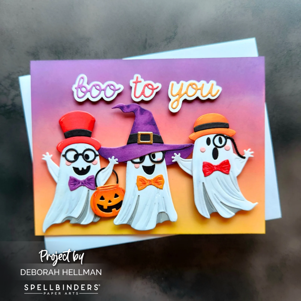 My first card features the Boo Crew Etched Die Set. These ghosts are soooo cute. The set includes hats, glasses, ties, arms, and a pumpkin so you can mix and match your ghosts.