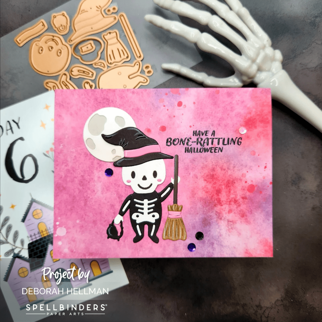 For Day 6, I wanted to create a pink and purple, fun, Halloween card. The skeleton has a bunch of small parts, but it is easy to assemble. I also added a die cut moon.