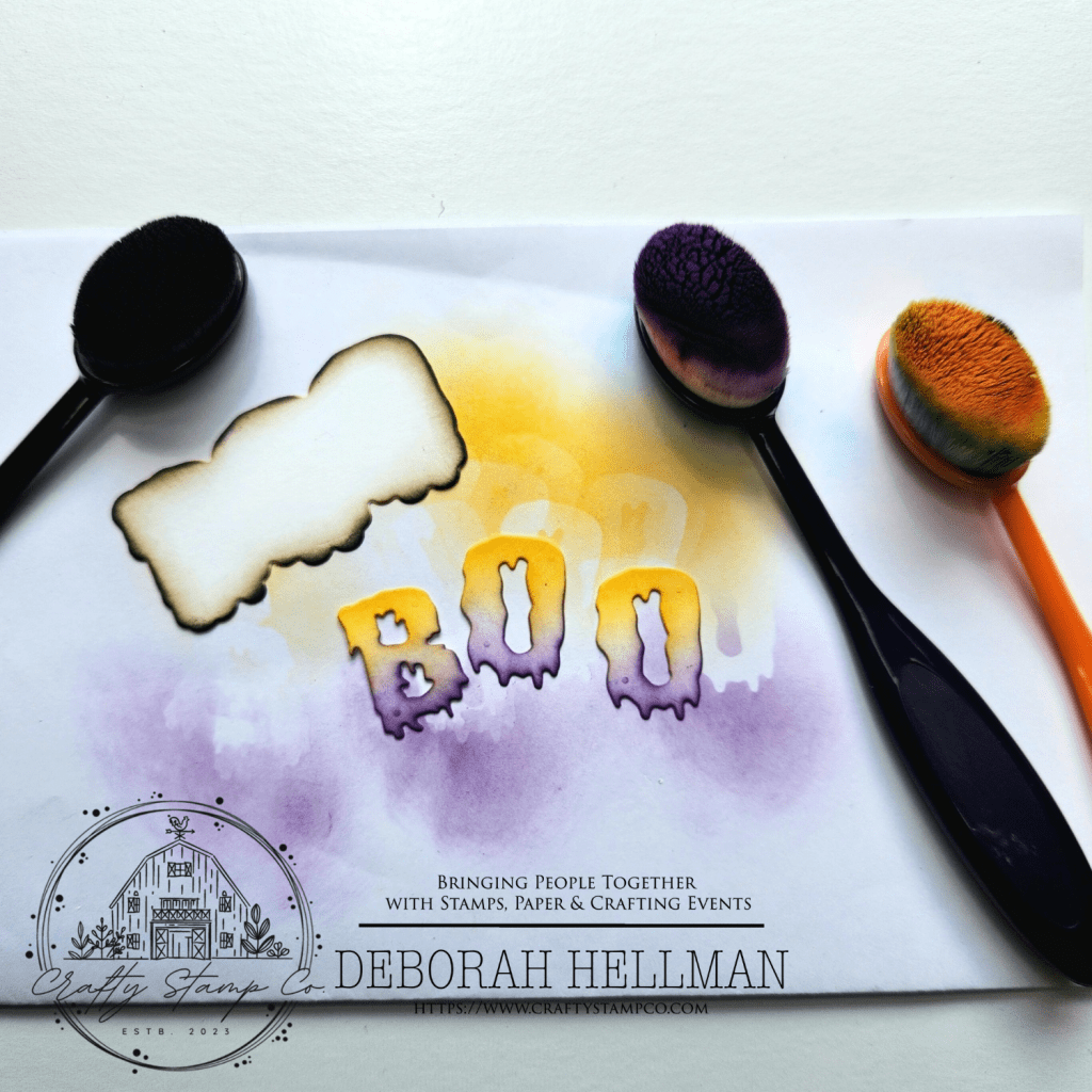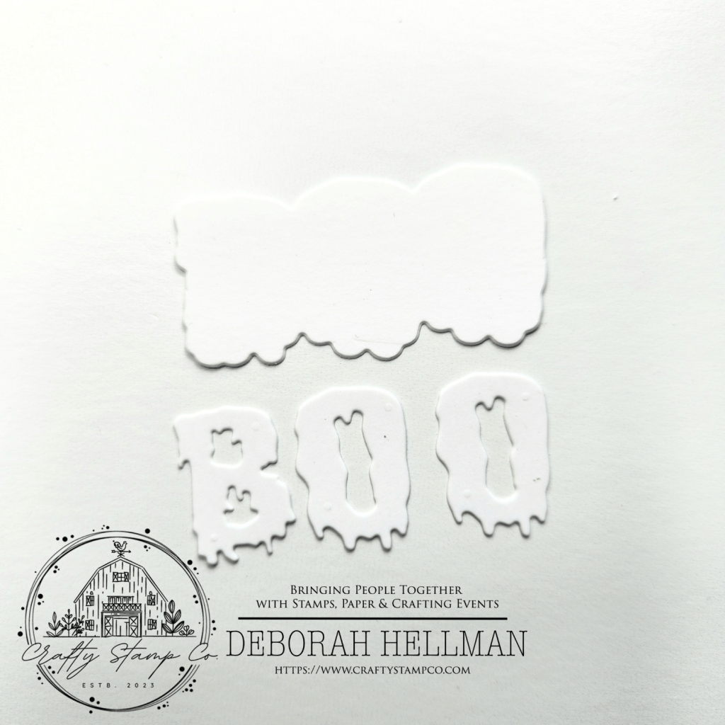 Next, I die cut a “Boo” sentiment from a heavy and smooth white cardstock. The weight of the paper makes it more sturdy, and the smoothness allows the ink to blend easier.
