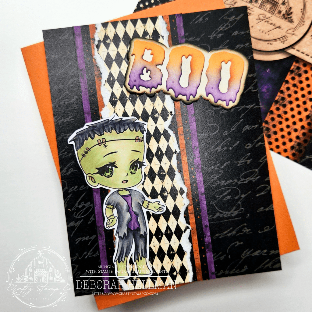 First, I stamped and colored Frankie using alcohol ink markers. He’s an adorable character and easy to color.