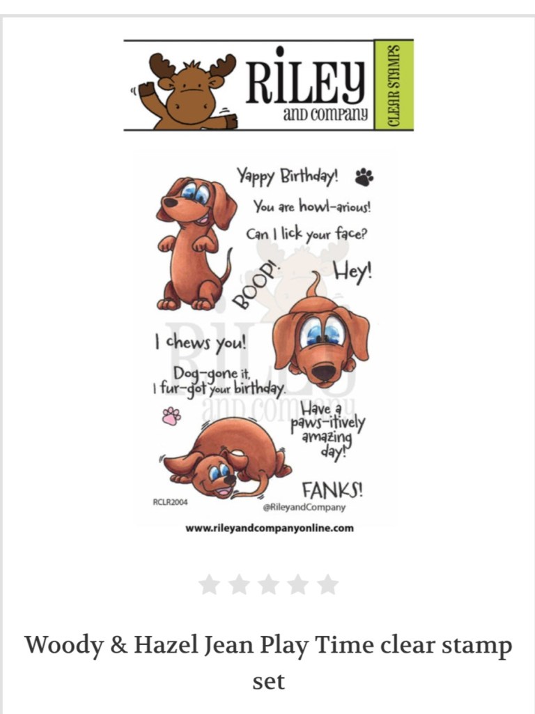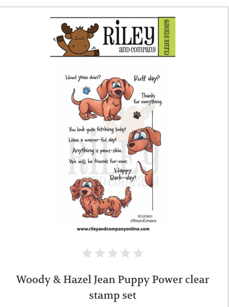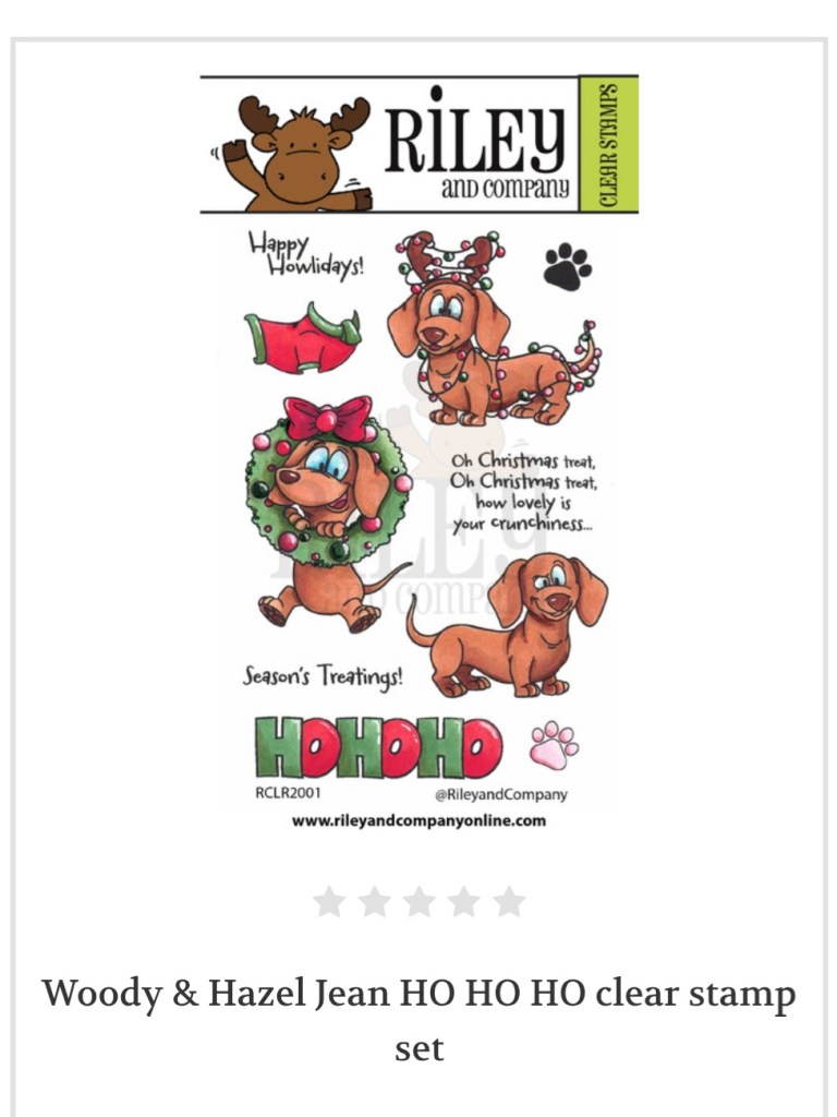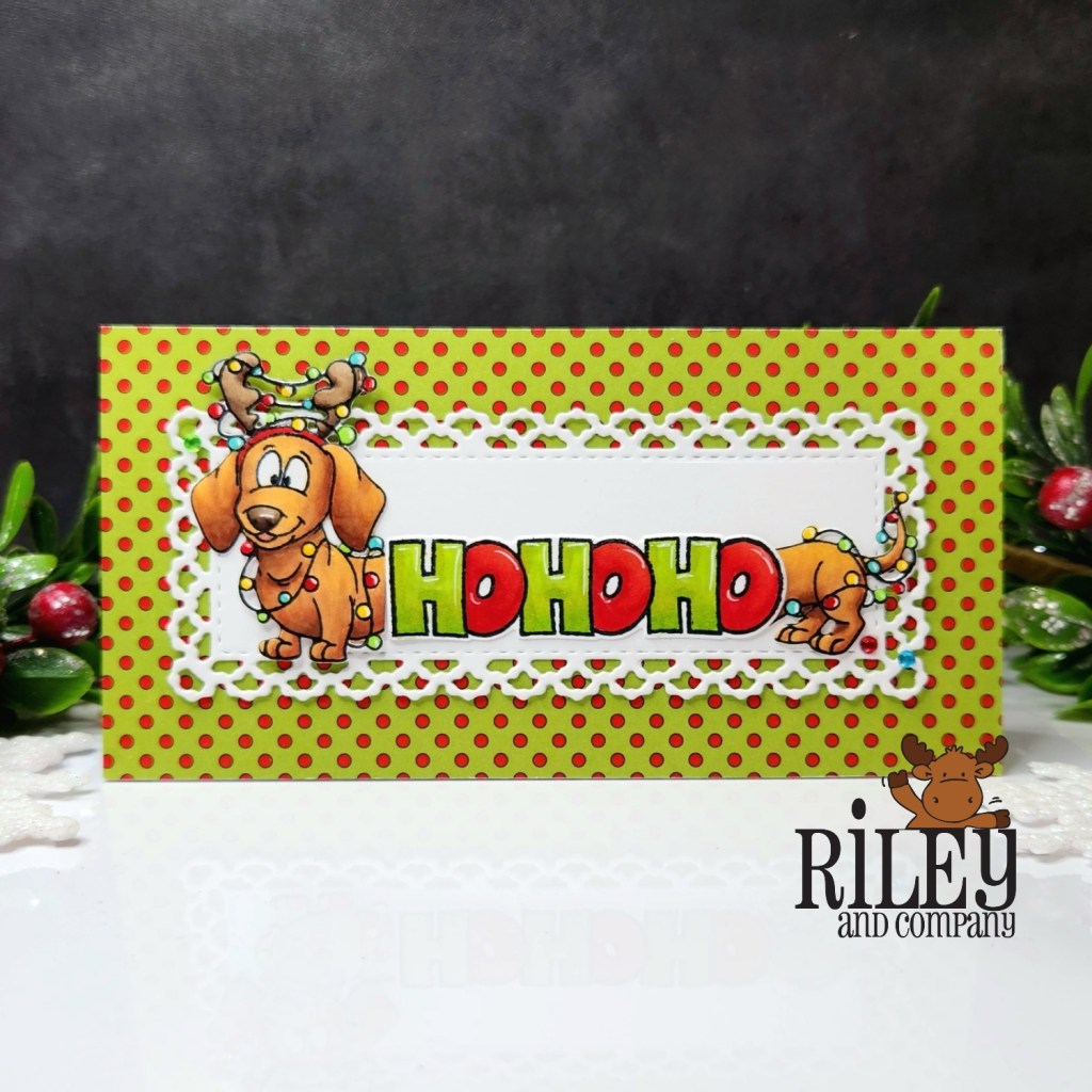 Riley & Company has just released three adorable dog (dachshund) stamp sets with coordinating dies. I used the Woody & Hazel Jean Ho Ho Ho set for this card, but there are also two other sets in this release that are for anytime. After stamping and coloring, I cut the dachshund stamped image in half with the Ho Ho Ho sentiment in the middle for a bit of added humor. The stamp sets were inspired by Woody and Hazel Jean.