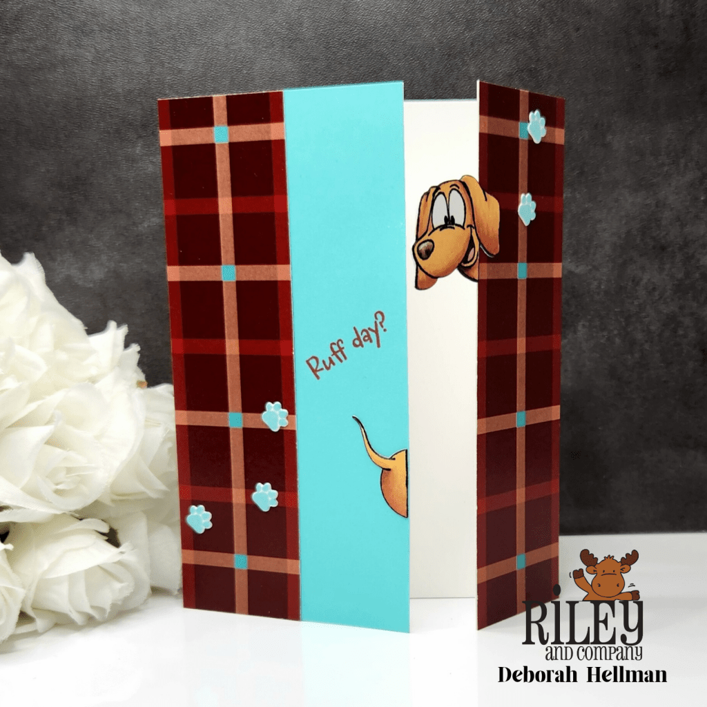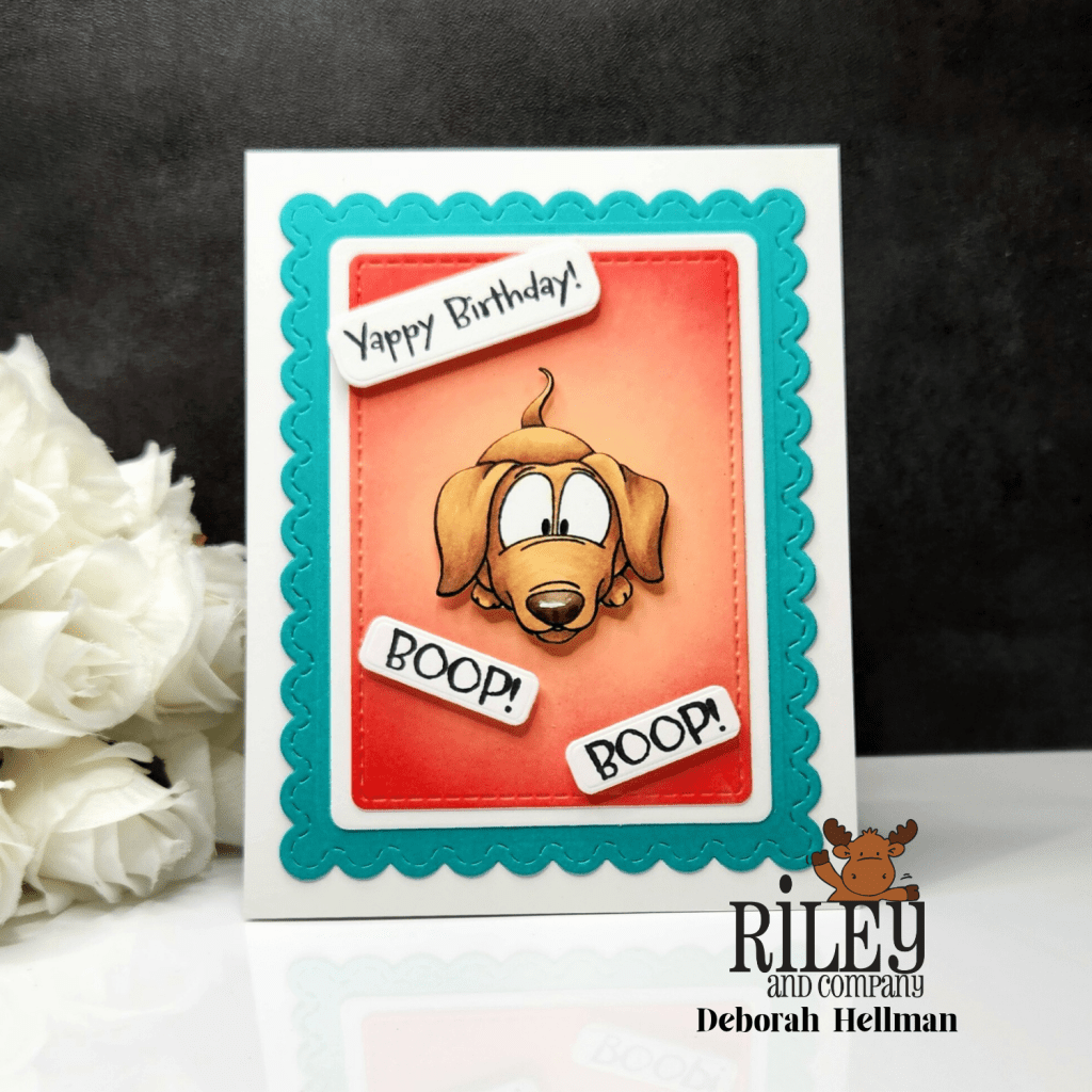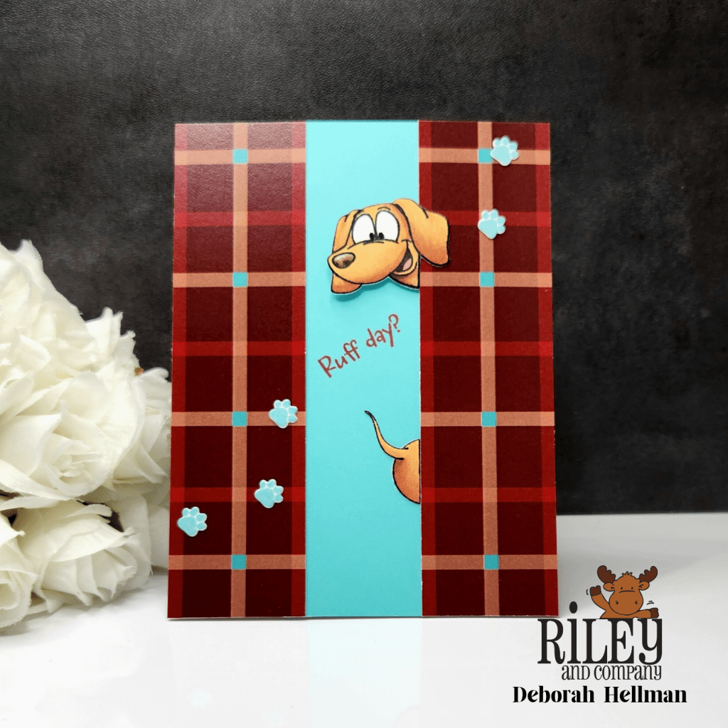 Riley & Company has just released three adorable dog (dachshund) stamp sets with coordinating dies. I used the Woody & Hazel Jean Ho Ho Ho set for this card, but there are also two other sets in this release that are for anytime. After stamping and coloring, I cut the dachshund stamped image in half with the Ho Ho Ho sentiment in the middle for a bit of added humor. The stamp sets were inspired by Woody and Hazel Jean.