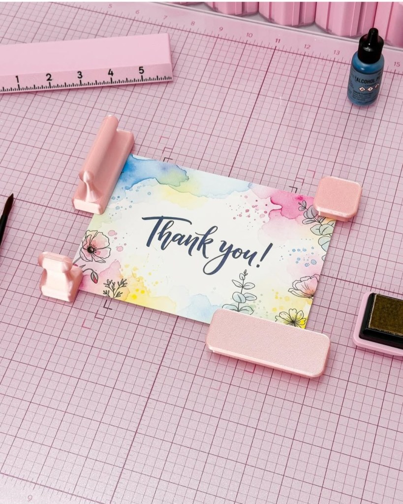 1. Pink Sparkle Magnetic Glassboard Mat from Glassboard Studios. They have lots of design options, all of them are beautiful. I would get one that catches you eye and would look good in your crafting space. The 24″ x 35″ is a popular size with cardmakers. Glass mats are great for doing all types of crafts. They wipe up cleanly, you can smush your ink pads on them spritz with water and then blot up the ink on a piece of watercolor paper for a unique background. The magnetic ones have the bonus ability to hold papers and stencils in place by using magnets. It is like having an extra set of hands! 😁